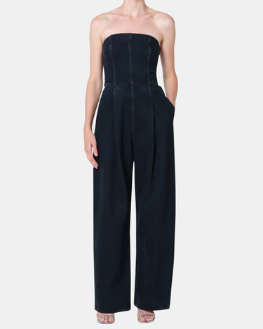 - Looks Like: Deep dark, almost-black indigo denim strapless jumpsuit
