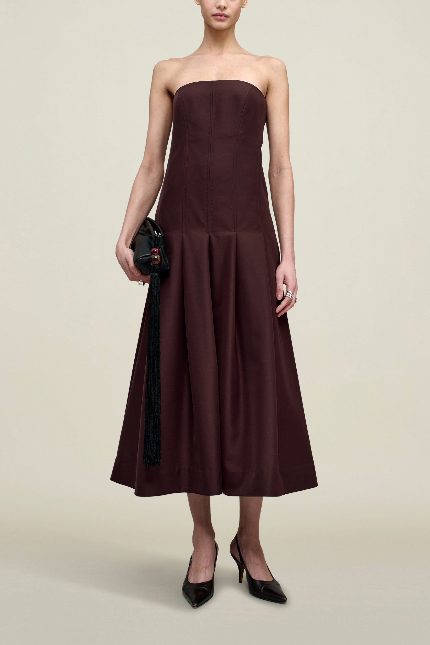 The Maeve Pleated Dress by Kallmeyer. Strapless dress in elegant mahogany wool gazar with a structured bodice and tailored pleated skirt. Features removable straps for versatile styling options and princess seam construction for a sculpted fit through the high waist. The fitted bodice transitions to a graceful pleated skirt that creates elegant movement and a flattering fit. Perfect for evening occasions or elevated daytime looks.