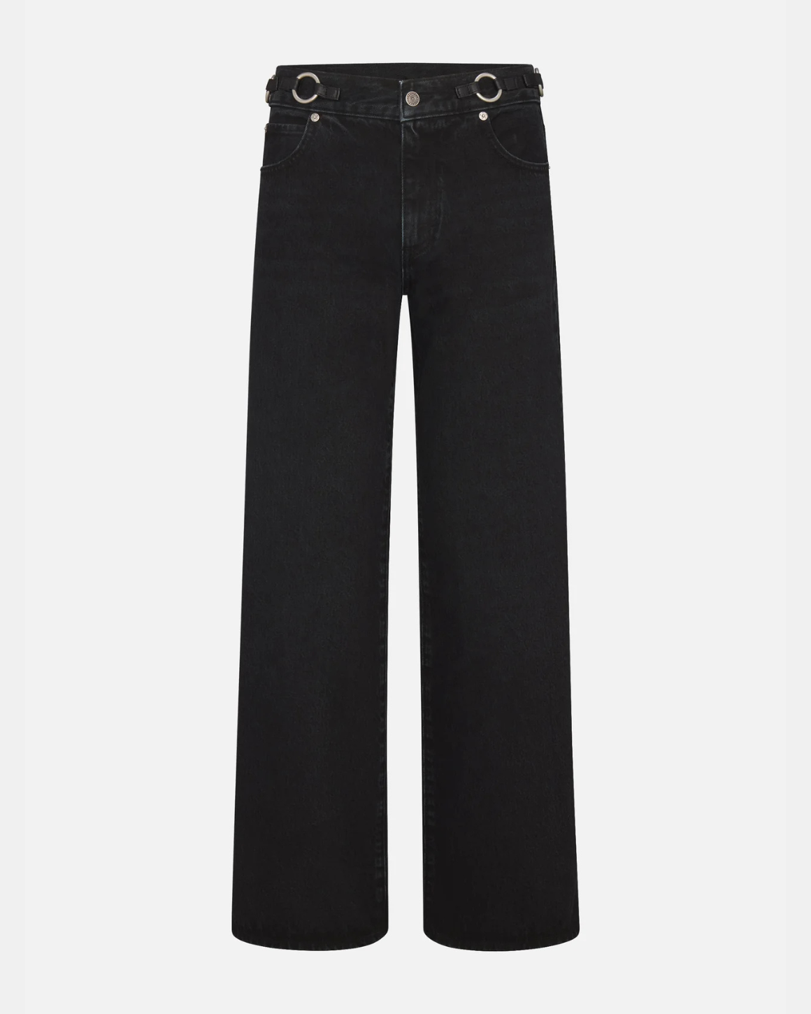 The O-Ring Stroll by FRAME. A signature silhouette with an edgy twist. The Stroll gets a bold update with silver O-ring embellishments along the waistband, accented by leather trim and a sleek black wash. This mid-rise, relaxed wide-leg style combines effortless cool with FRAME’s elevated craftsmanship.