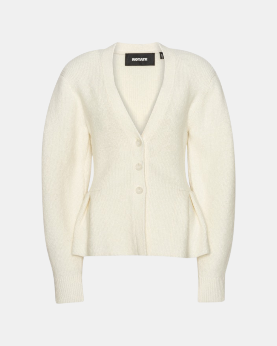 The Cardigan with Peplum by ROTATE is a knitted piece crafted from a soft alpaca and wool blend, offering cozy warmth and a luxuriously textured finish. Designed with a deep V-neckline, long sleeves, and a subtle peplum at the waist, it creates a naturally structured, feminine shape. The front button fastening with three buttons adds a classic touch to this modern wardrobe essential.