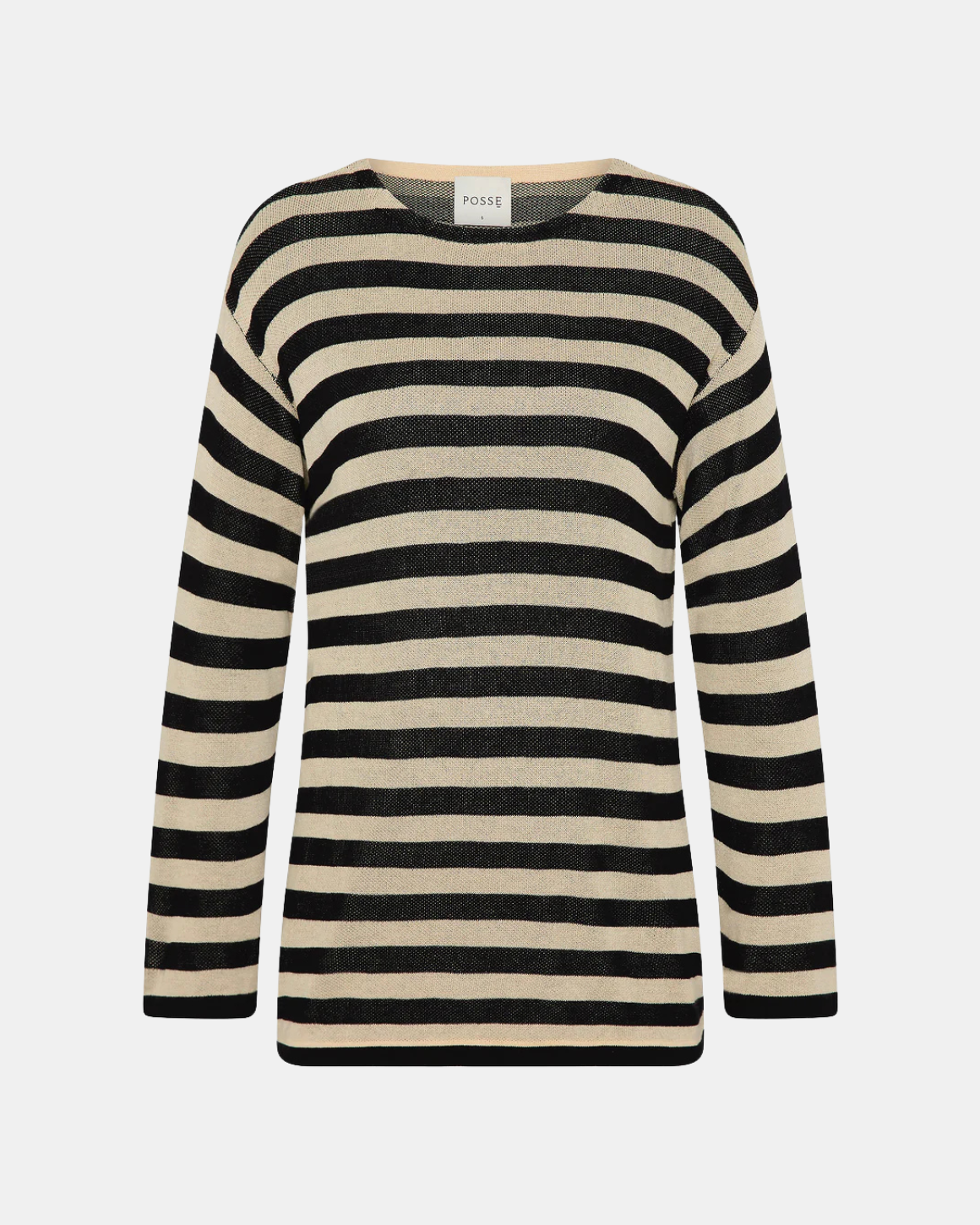 The Miles Top by POSSE is knitted in a lightweight cream and black stripe and designed in a relaxed, oversized silhouette. It features a boat neckline, dropped shoulders, and long sleeves.