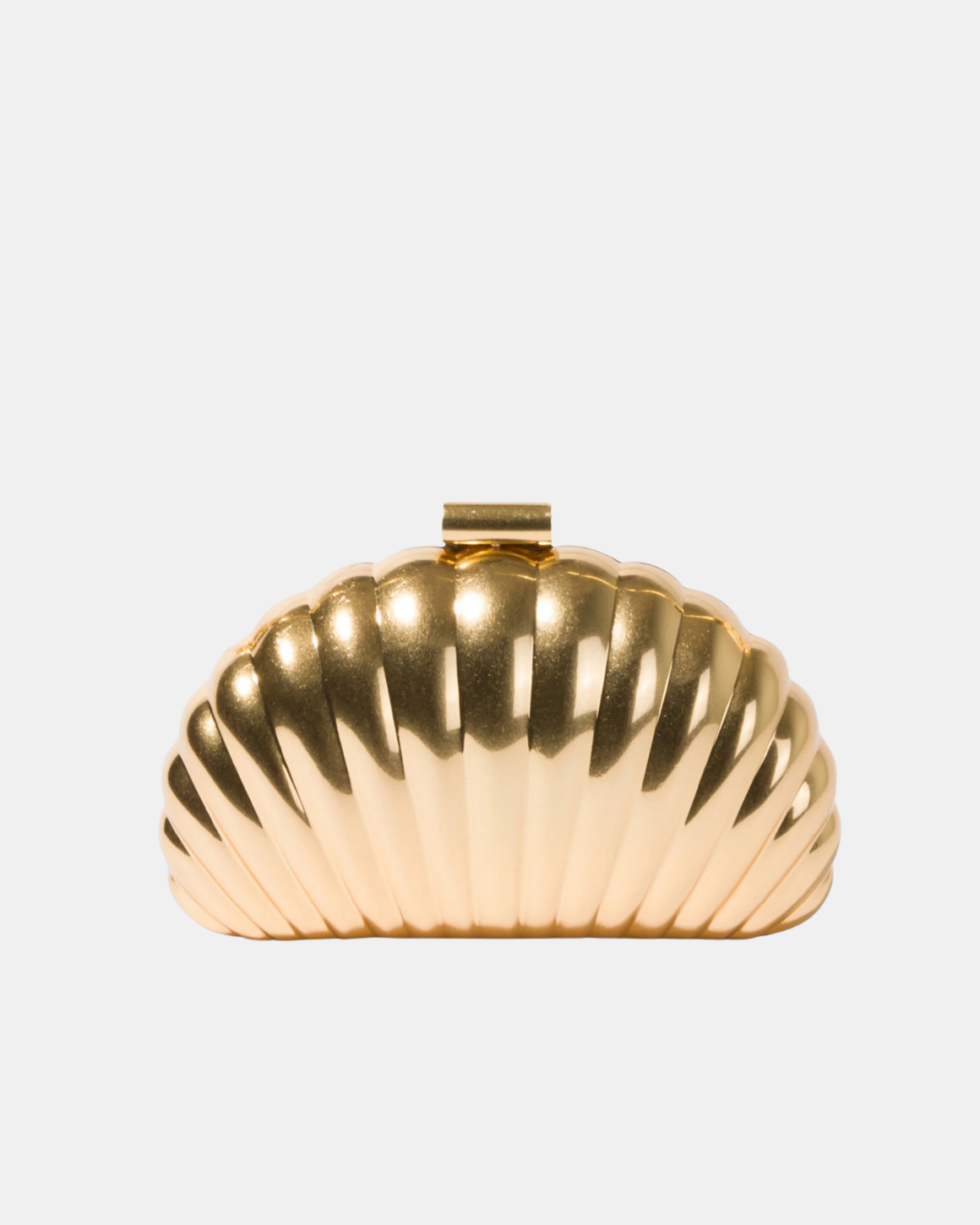 The Monet Shell Clutch by Simkhai. Boasting a ribbed shell design, this compact accessory combines form and function, complete with a slender chain strap, making it the epitome of elegance.