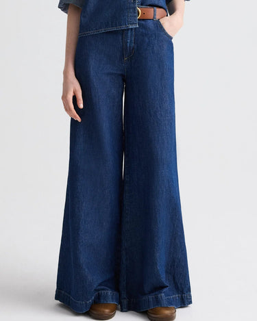 Wide-leg jean in cotton-linen denim. The Dillon Jean is designed with a high-rise waist and a long, straight leg that falls effortlessly to the floor. Finished with a clean back, front pockets, and a classic zip fly.