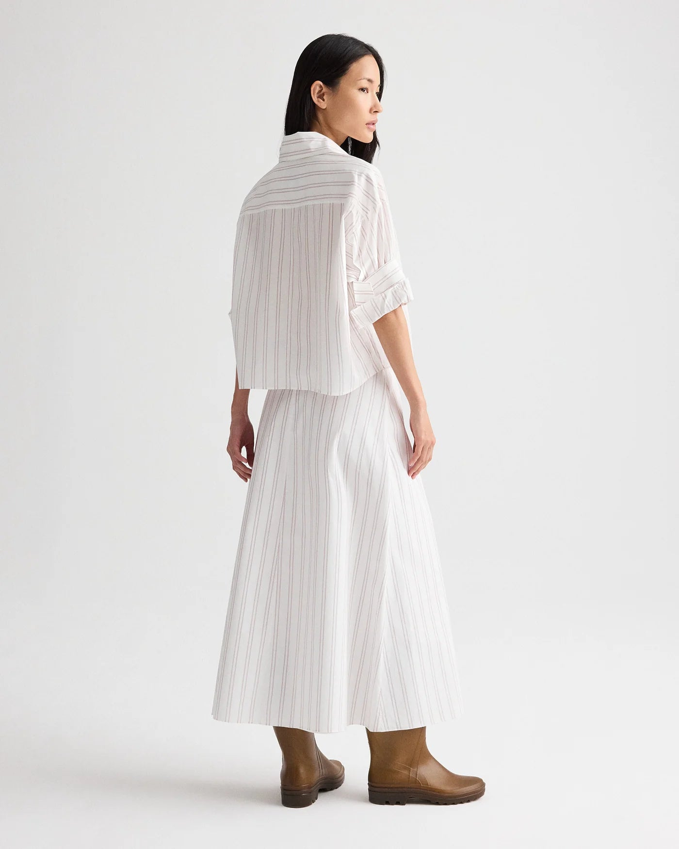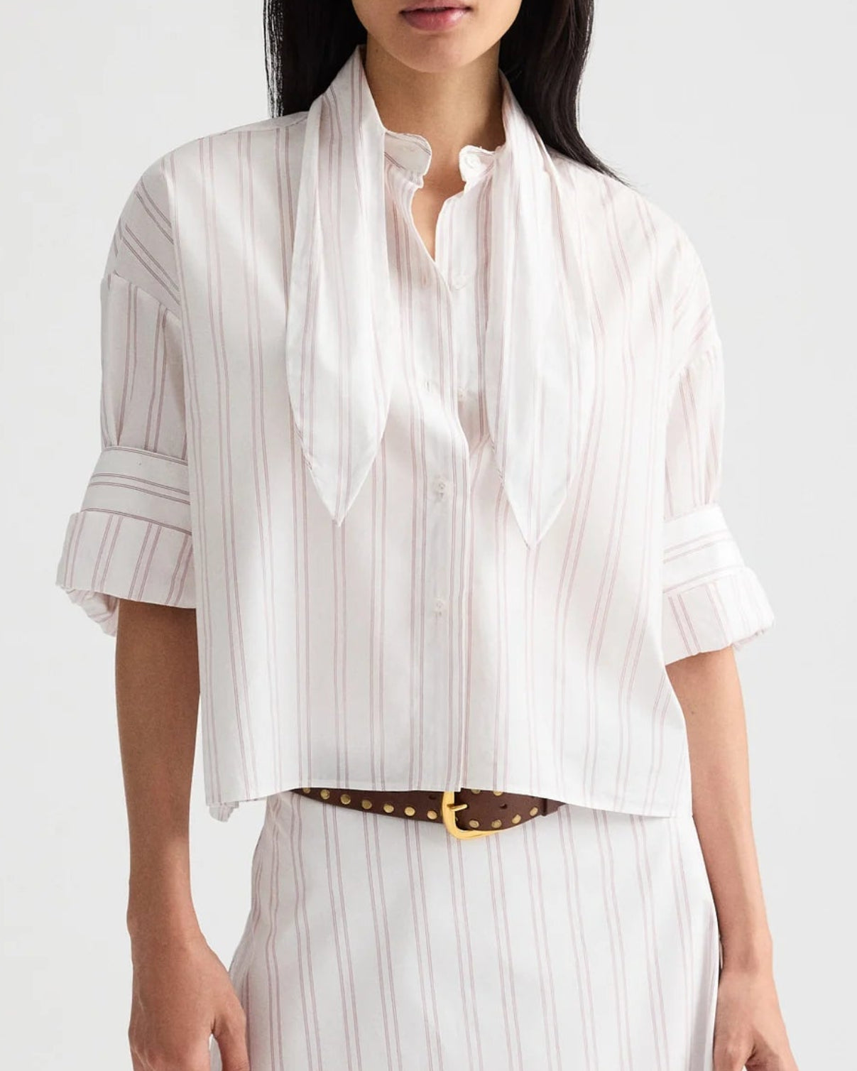 Cropped button-down in superfine Italian cotton shirting with a drop needle double stripe and an attached neck tie at the collar. Tie One On has a boxy silhouette with long sleeves finished in signature double-roll button cuffs. Complete with a chest patch pocket, button-front placket, and band collar.