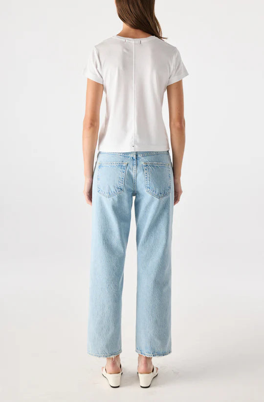 This cropped, wide straight leg is AMO's easiest fit yet. Cut from premium rigid denim with a mid rise, this pair is meant to sit low on the hips for a relaxed look. Thoughtful distressing throughout. Zip fly.