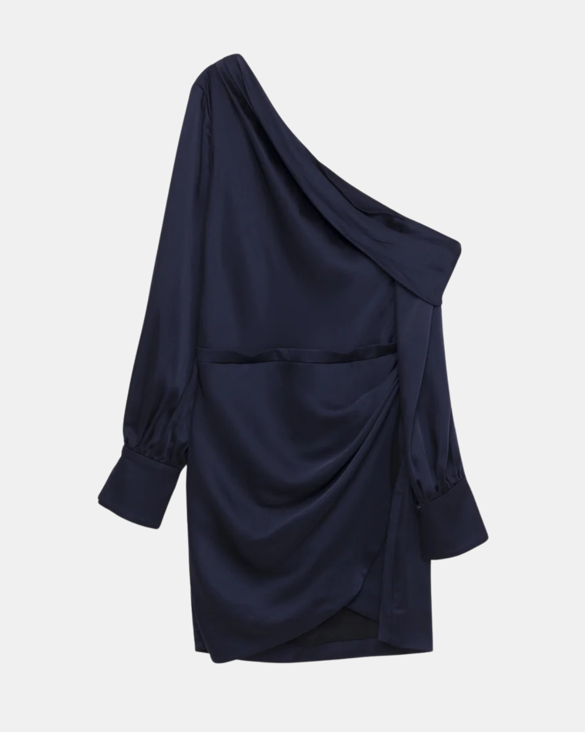 The Cameron Dress in Midnight by Simkhai. High sheen satin elegantly draped with romantic cold shoulder and buttoned cuffs. With a slimming, cinched waist and wrapped mini skirt hemline for powerfully feminine posturing.
