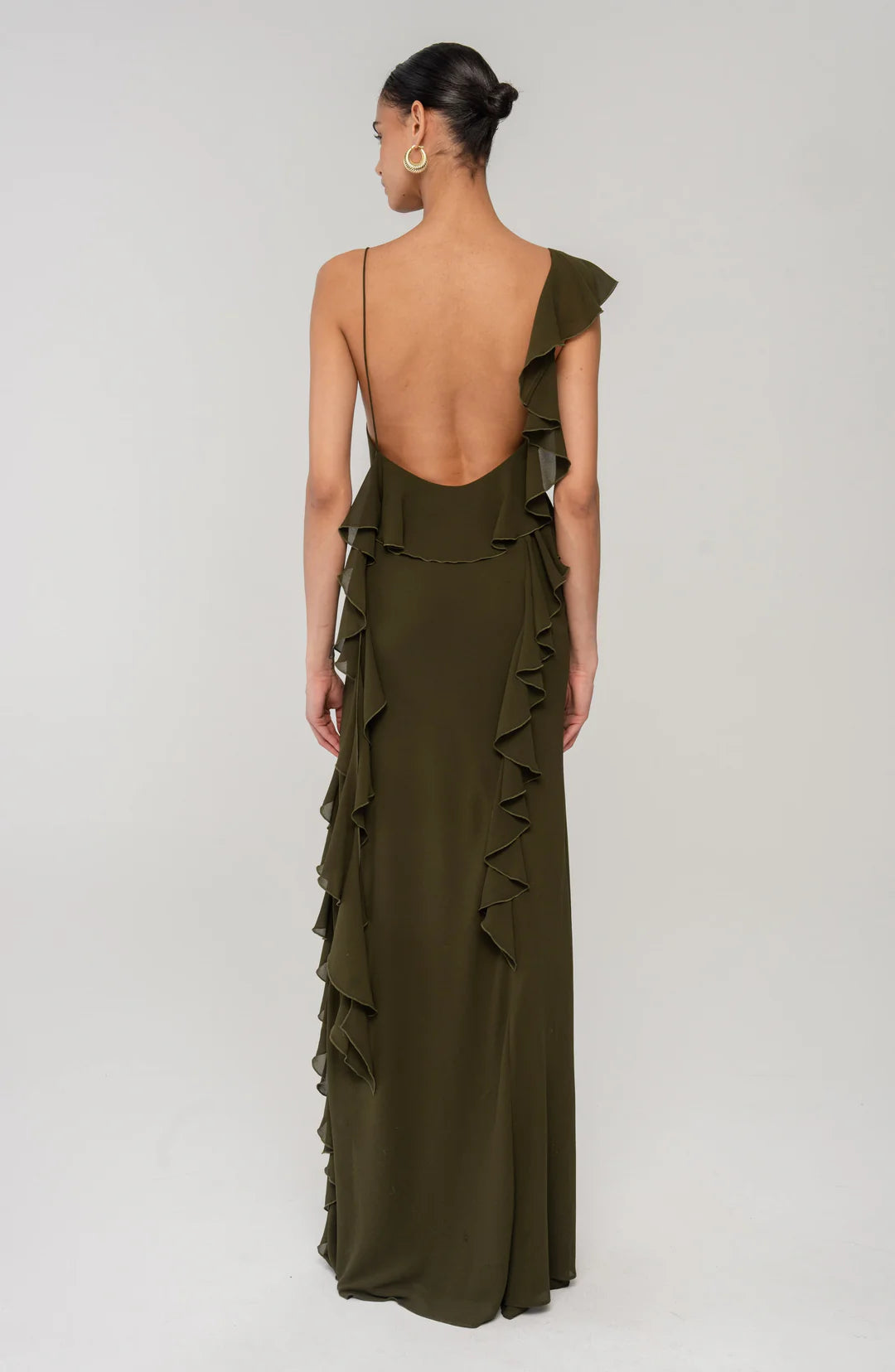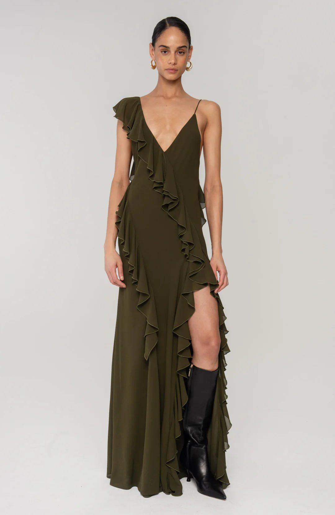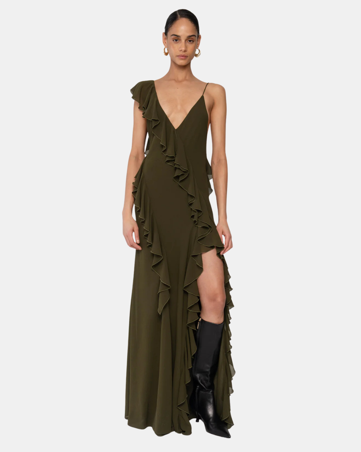 Romantic with an edge, the Olivalle Dress by Ronny Kobo features asymmetrical ruffles that cascade down a plunging neckline and dramatic slit. Its rich green hue adds depth, while the fluid silhouette moves effortlessly from day to night.