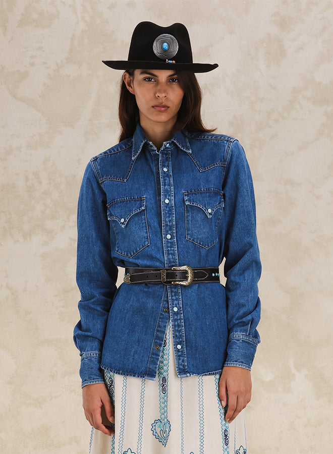 The Denim Texan Shirt by Fortela. A modern twist on classic western style, this durable denim shirt features signature pointed yoke stitching, dual flap chest pockets with snap closures, and snap buttons down the front and cuffs. The tailored fit is enhanced with a sleek waist belt, creating a flattering silhouette. Long sleeves add versatility for layering or standalone wear.