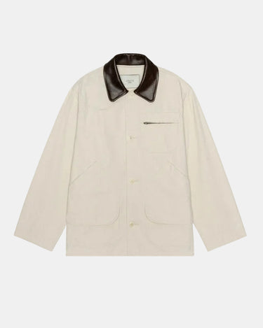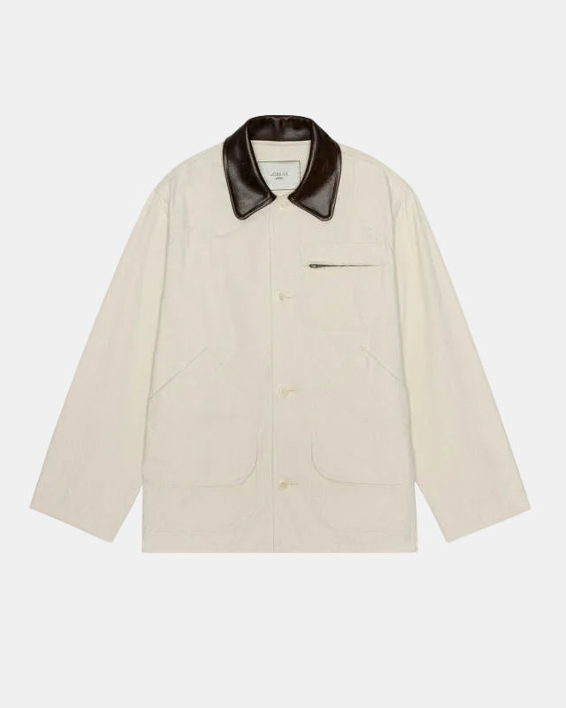 A take on a heritage New England-style workwear jacket, designed with a relaxed fit. It features utility pockets, pleated vents at the back, and is made from garment-dyed cotton canvas. The contrast collar is crafted from genuine leather, and the jacket is finished with corozo buttons at the front placket and cuffs.