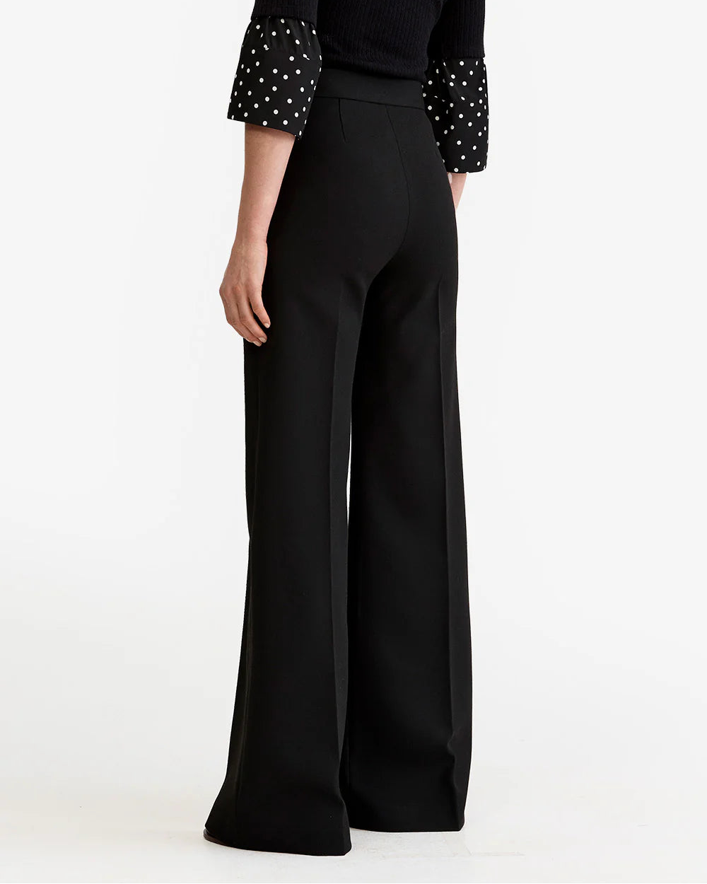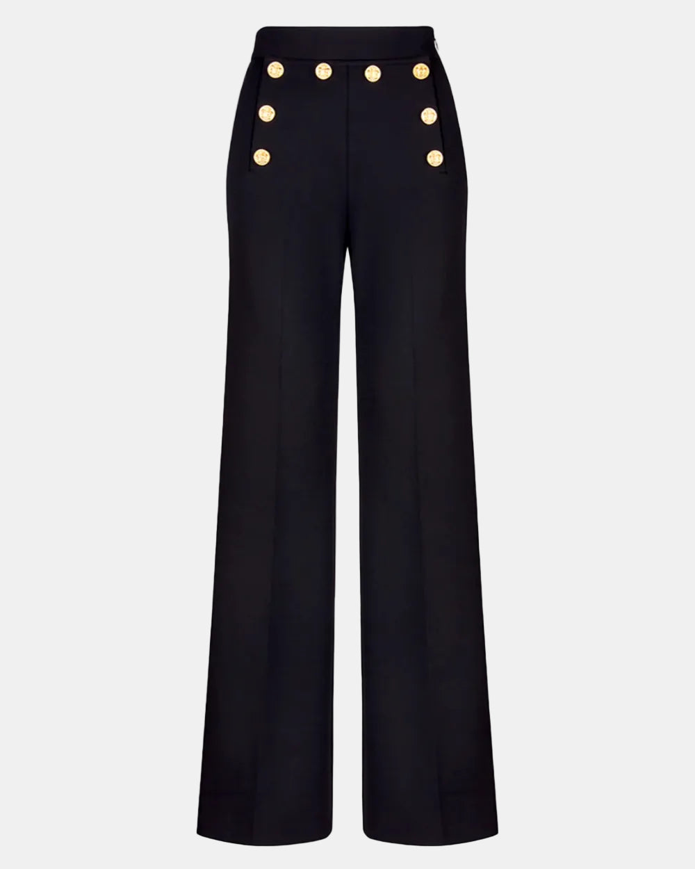 High-rise with a wide, full-length leg, this stretch silhouette is fitted through the waist and hips and features nautical brass buttons. Closure is a hidden side seam zipper.