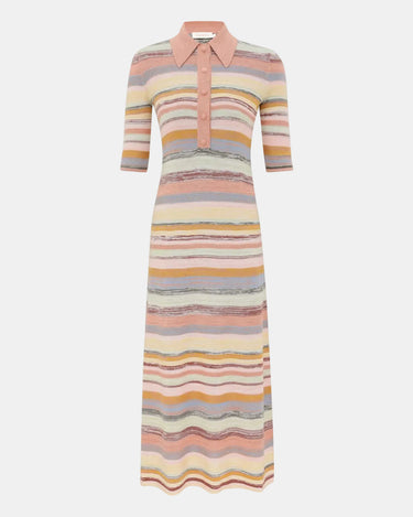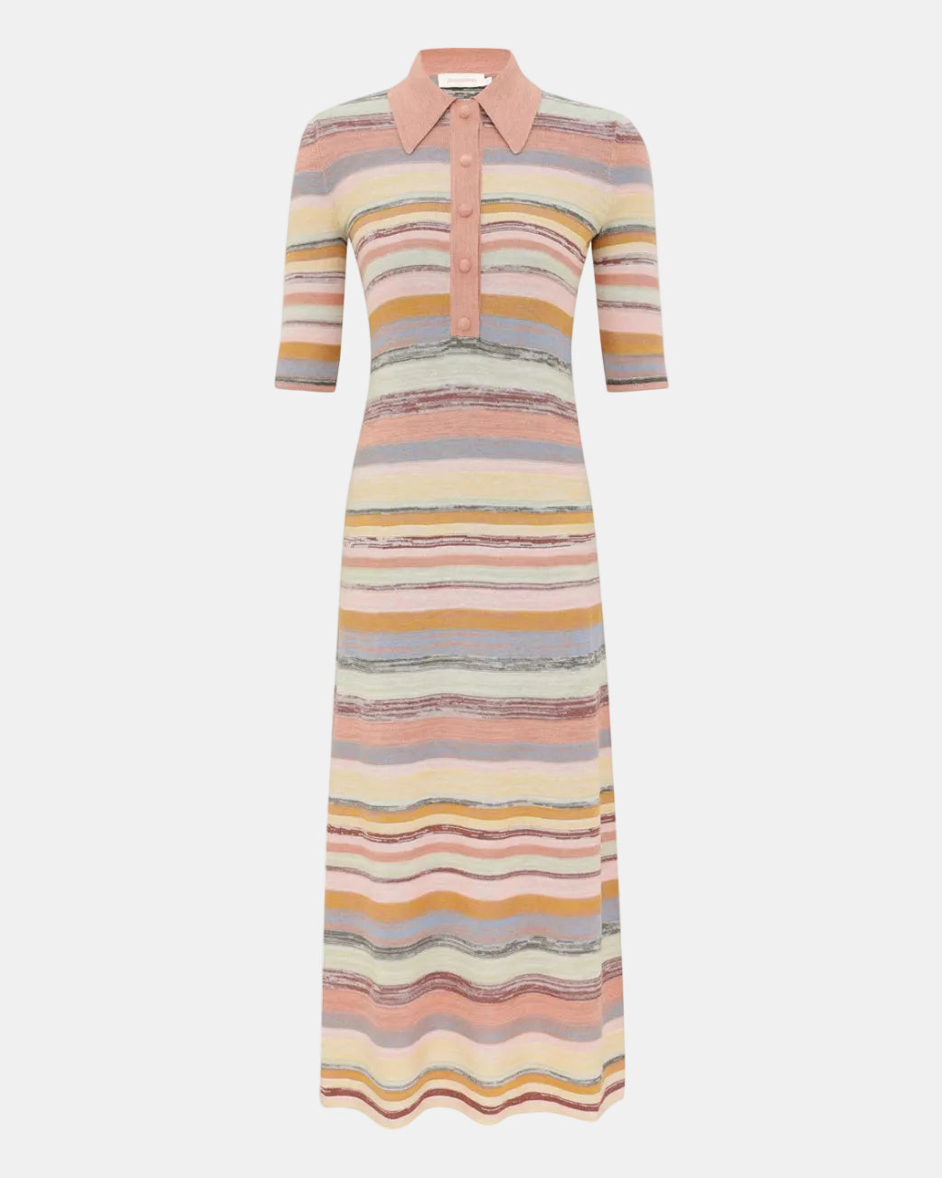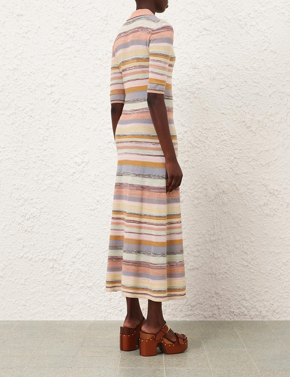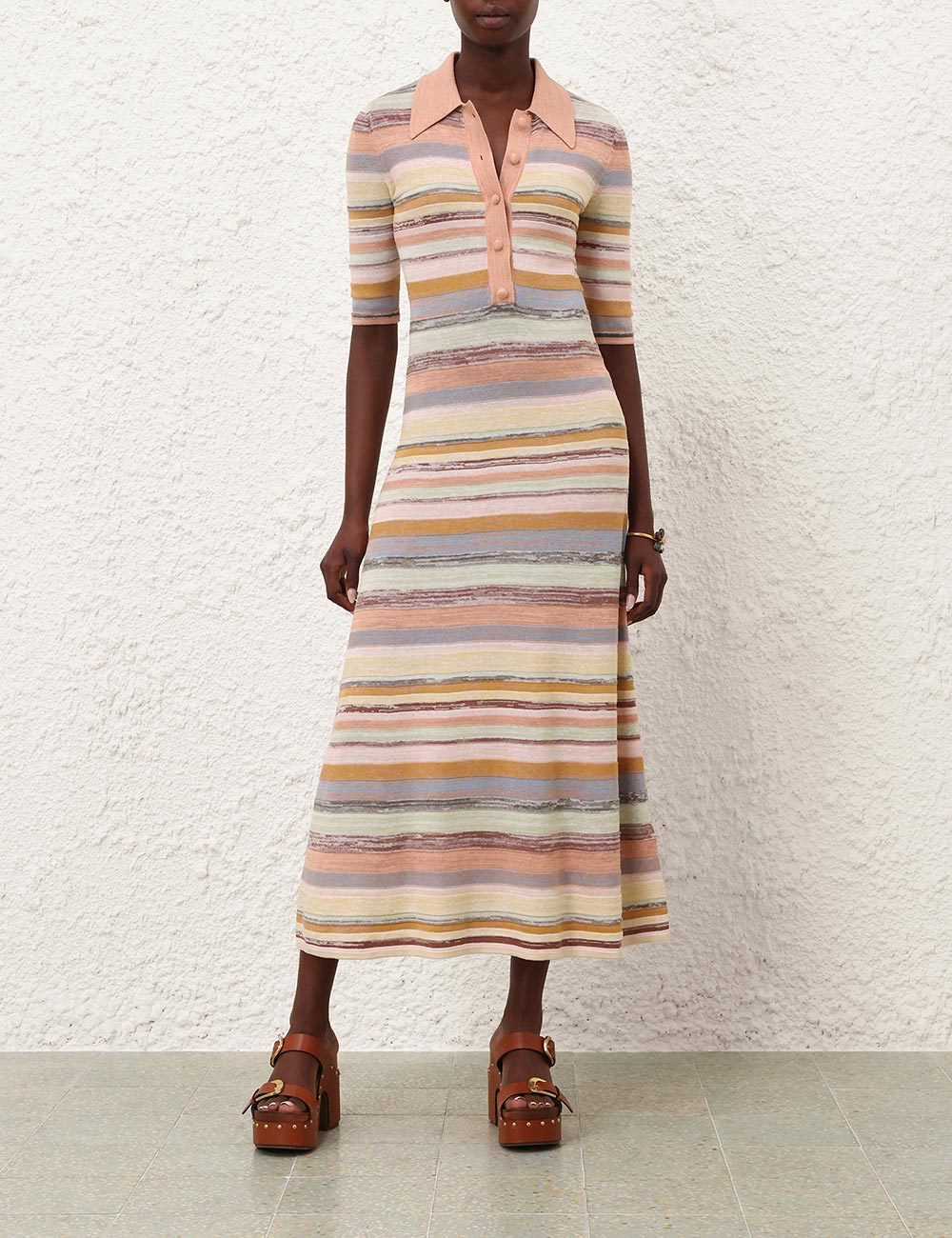 The Luna Mouline Polo Midi Dress in Multi Stripe from Zimmermann's Spring 2026 Collection, Kindred Spirit. A cotton-linen midi dress featuring a classic collar, three-quarter length sleeves, finished with centre front buttons and relaxed pleated skirt. Cotton-linen blend fabric. Midi-length knit dress. Three-quarter length, fitted sleeves. Centre front fabric buttons. Contrasting stripes throughout.