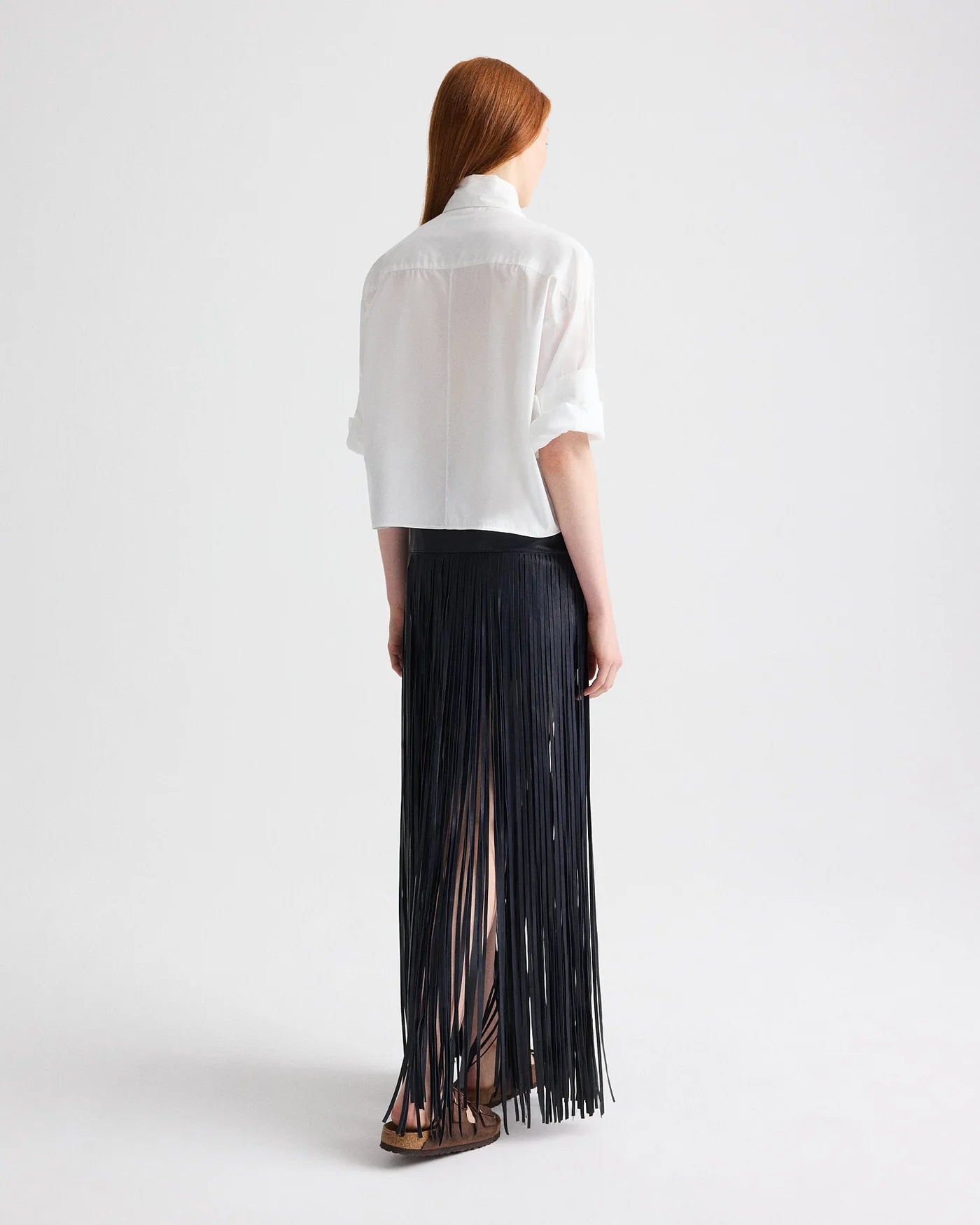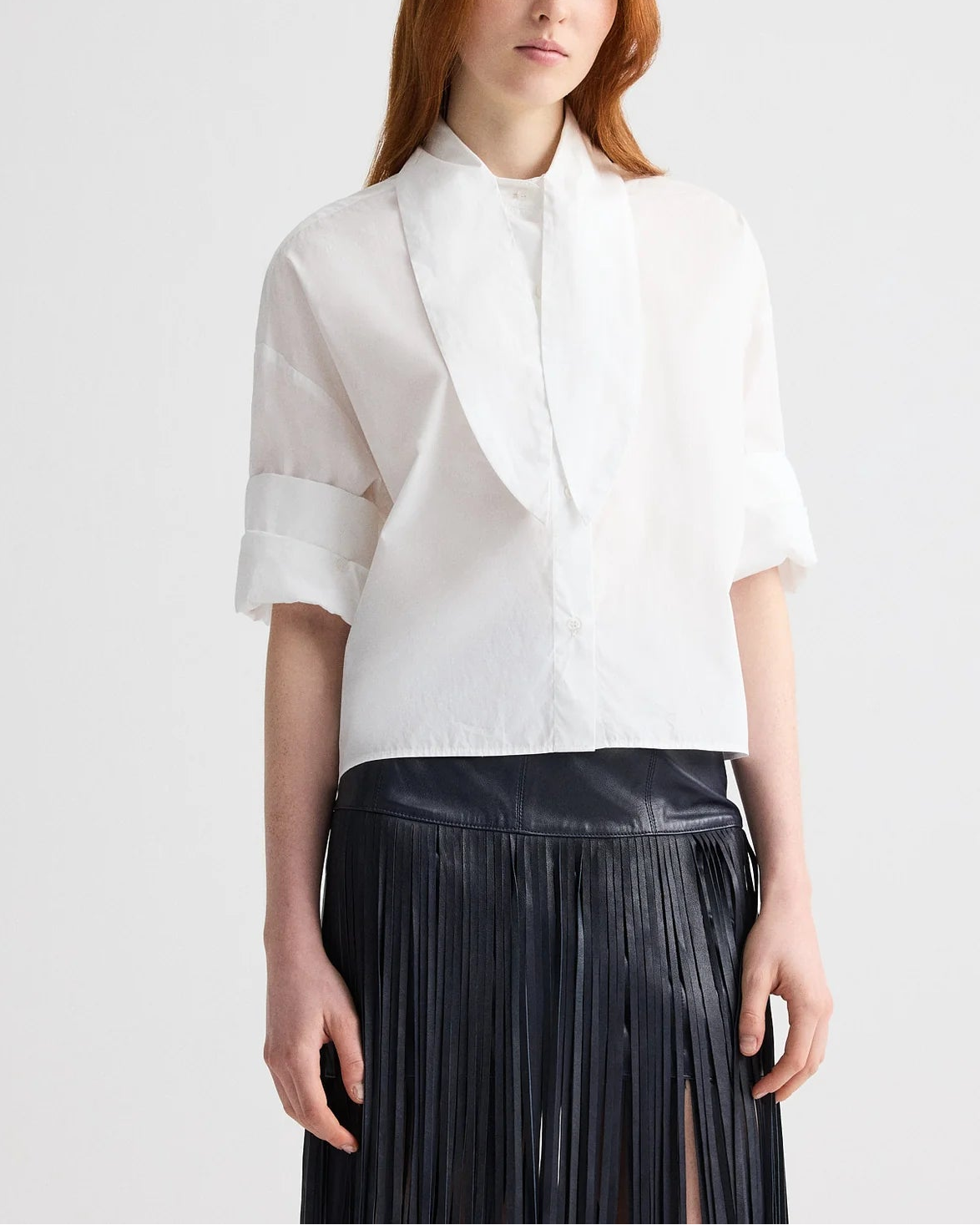 Cropped, short sleeved button down in superfine Italian cotton shirting, with a neck tie at the collar. The Tie One On Shirt is a cropped, boxy silhouette. Complete with a chest patch pocket, button up placket, spread collar, and our signature double roll button cuffs.