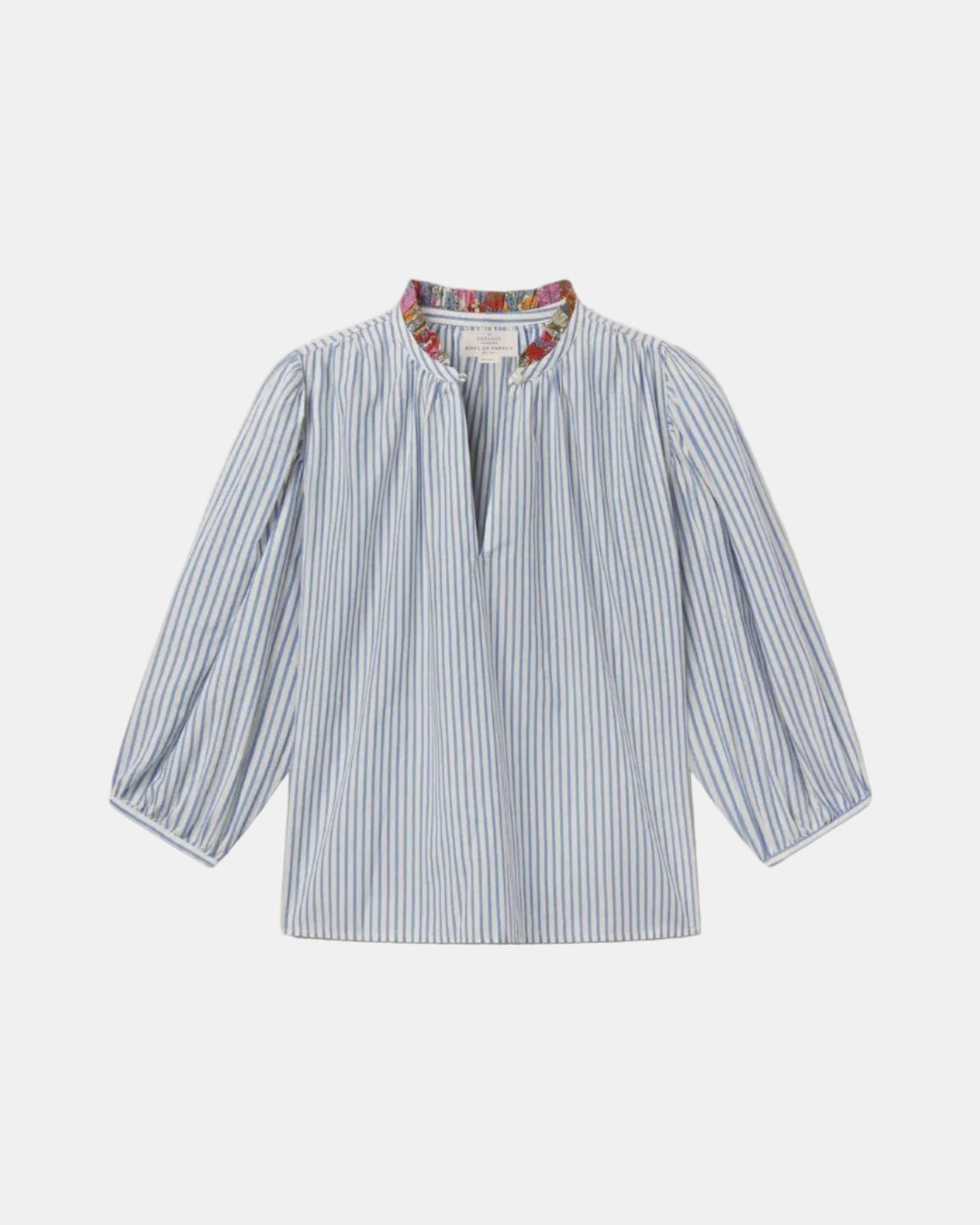 The Orly Blouse is a slightly cropped, billowy blouse with straight bottom hem, split v-neckline and buttoned crown collar. Gathered three-quarter length sleeves finished with delicate bindings. Includes a signature back detail with a gathered waist tab. Shown here in Seaside Stripe and made from a coastal cotton twill.