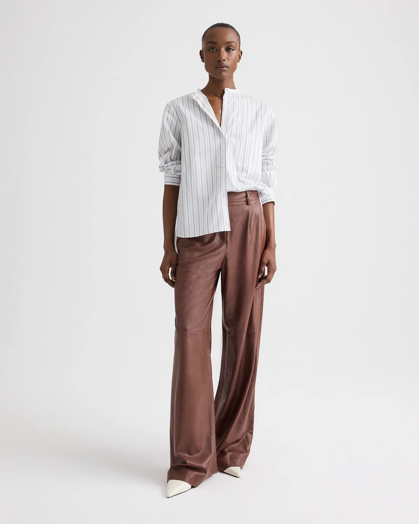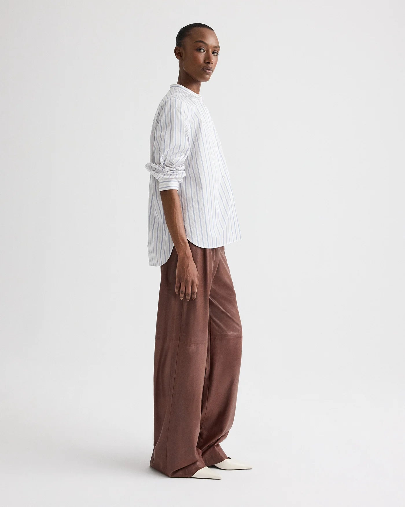 Relaxed button-down in superfine Italian cotton shirting with a mini awning stripe. Designed with a band collar and a back opening finished with an adjustable tie. Finished with a button-front placket, chest patch pocket, and long sleeves with cuffs.