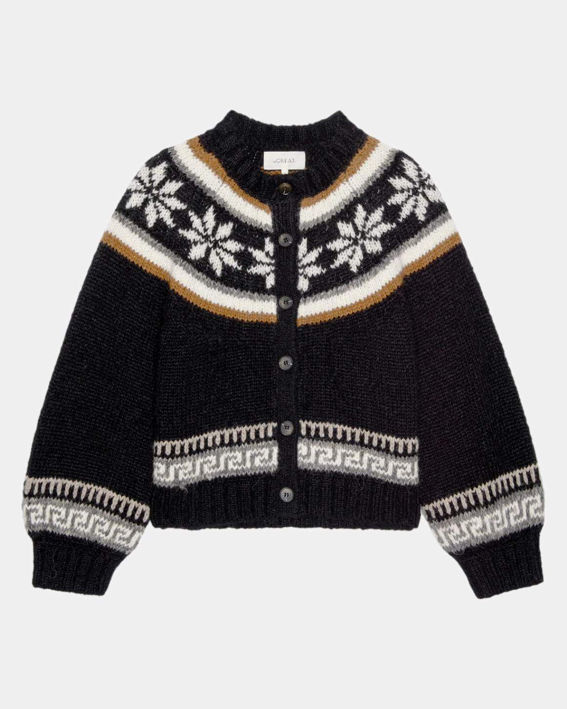 Knit from lofty alpaca yarn, this relaxed cardigan showcases a Nordic snowflake pattern inspired by heritage hand-knits. Finished with horn buttons, blouson sleeves, and rib trims, it’s an instant heirloom.