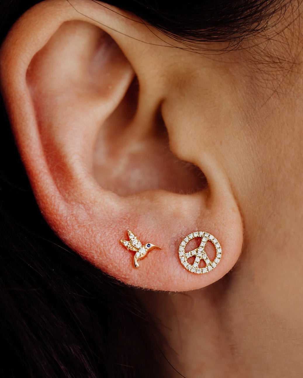 Tiny Hummingbird Stud Earrings by Sydney Evan. Delicate and charming, these tiny hummingbird stud earrings are crafted in 14k yellow gold and accented with sparkling pavé diamonds. Petite yet full of meaning, they make a subtle statement or pair beautifully with other earrings for a layered look.