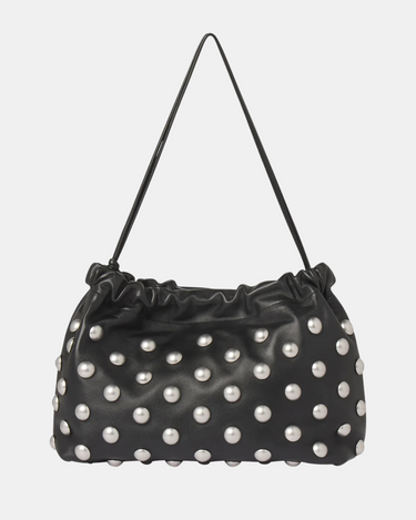 The Arlo Bag by A.L.C. is crafted from buttery-soft lamb leather in timeless black, punctuated with silver dome studs for a bold, modern effect. This shoulder silhouette features a softly ruched top and a slender adjustable strap, blending structure and slouch for a versatile statement.
