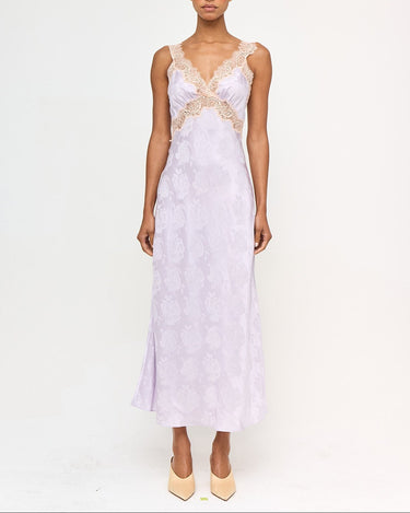 The Bryn Dress in purple with white lace is an ankle-length sundress with a lightly fitted bodice and flowing skirt. Airy and feminine, it drapes effortlessly and is perfect for sun-soaked days or evening strolls.