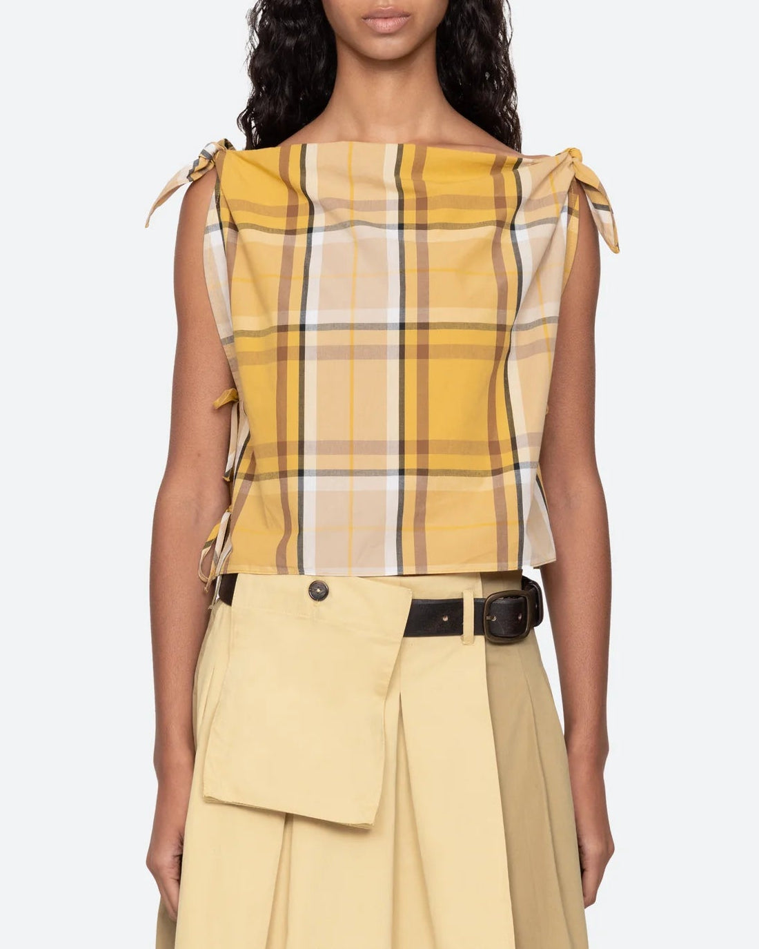 The Copeland plaid top features a relaxed, slightly cropped silhouette, with ties at the shoulders and sides for an easy, effortless finish.