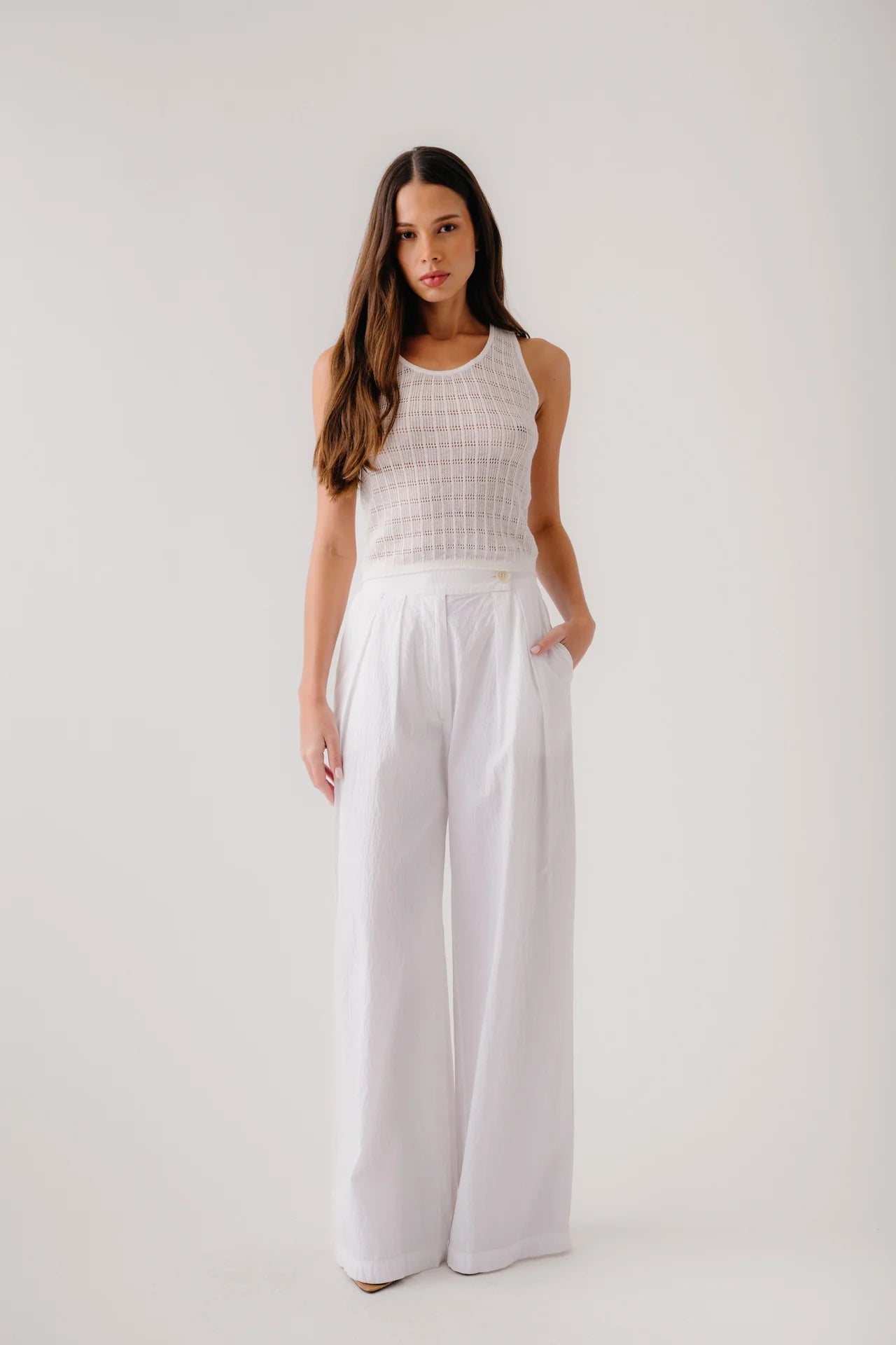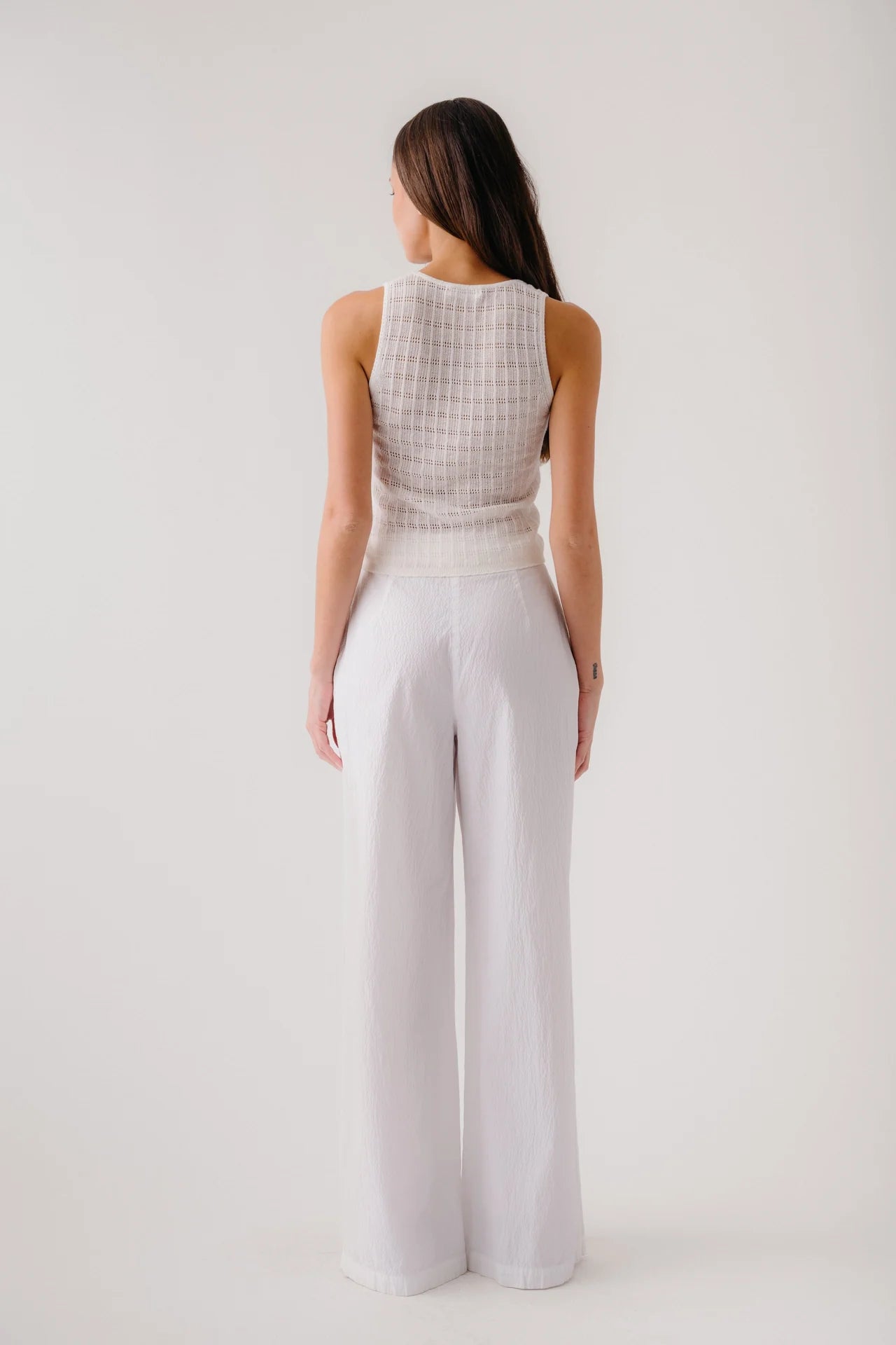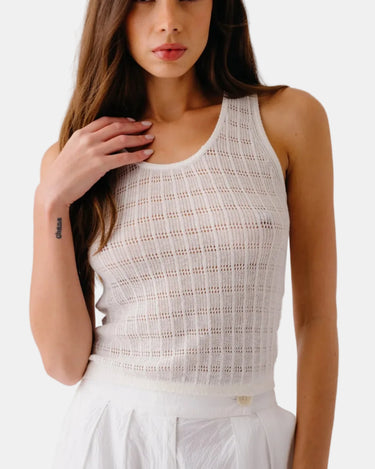 Pointelle stitch scooped neck tank in cotton silk cashmere.
