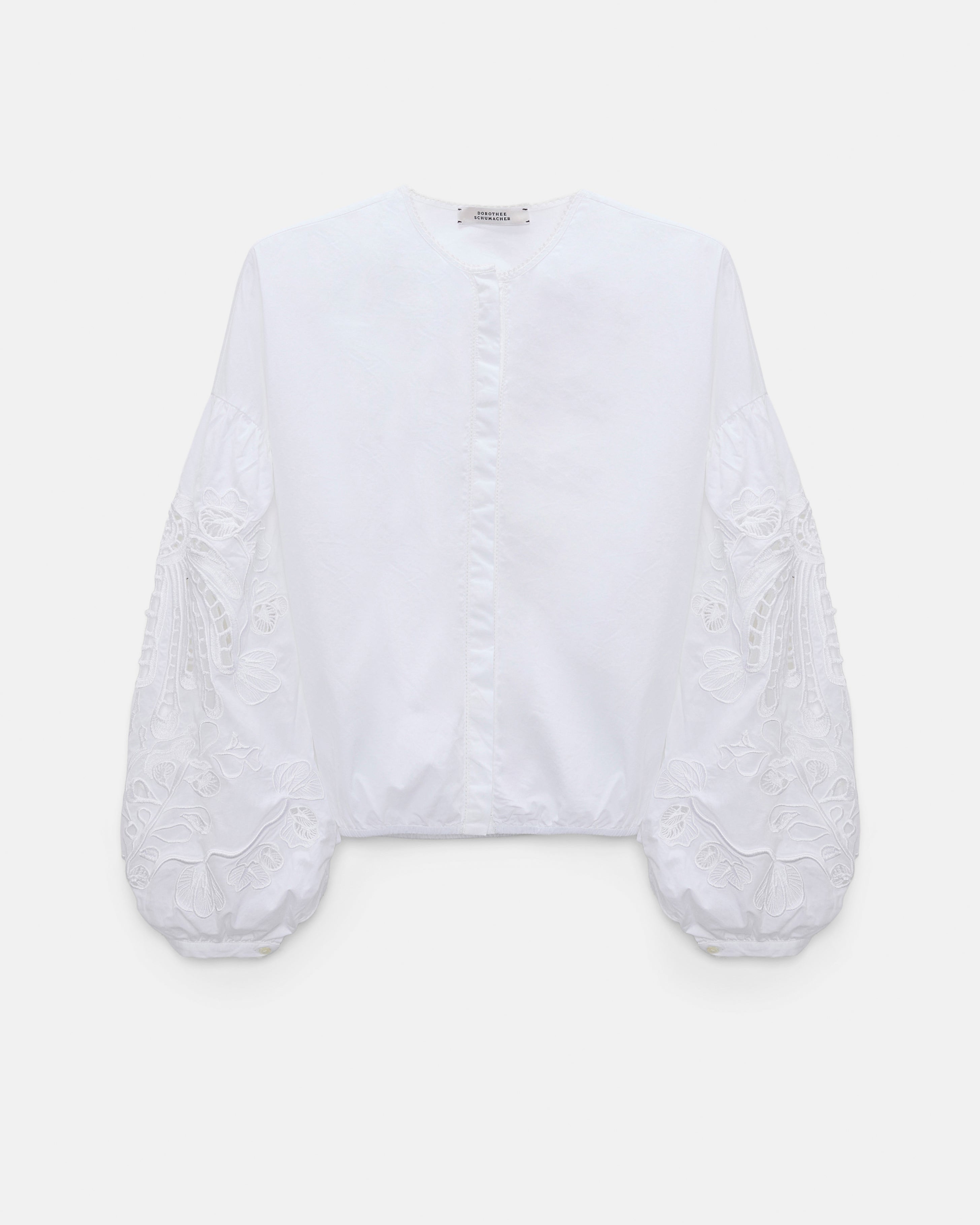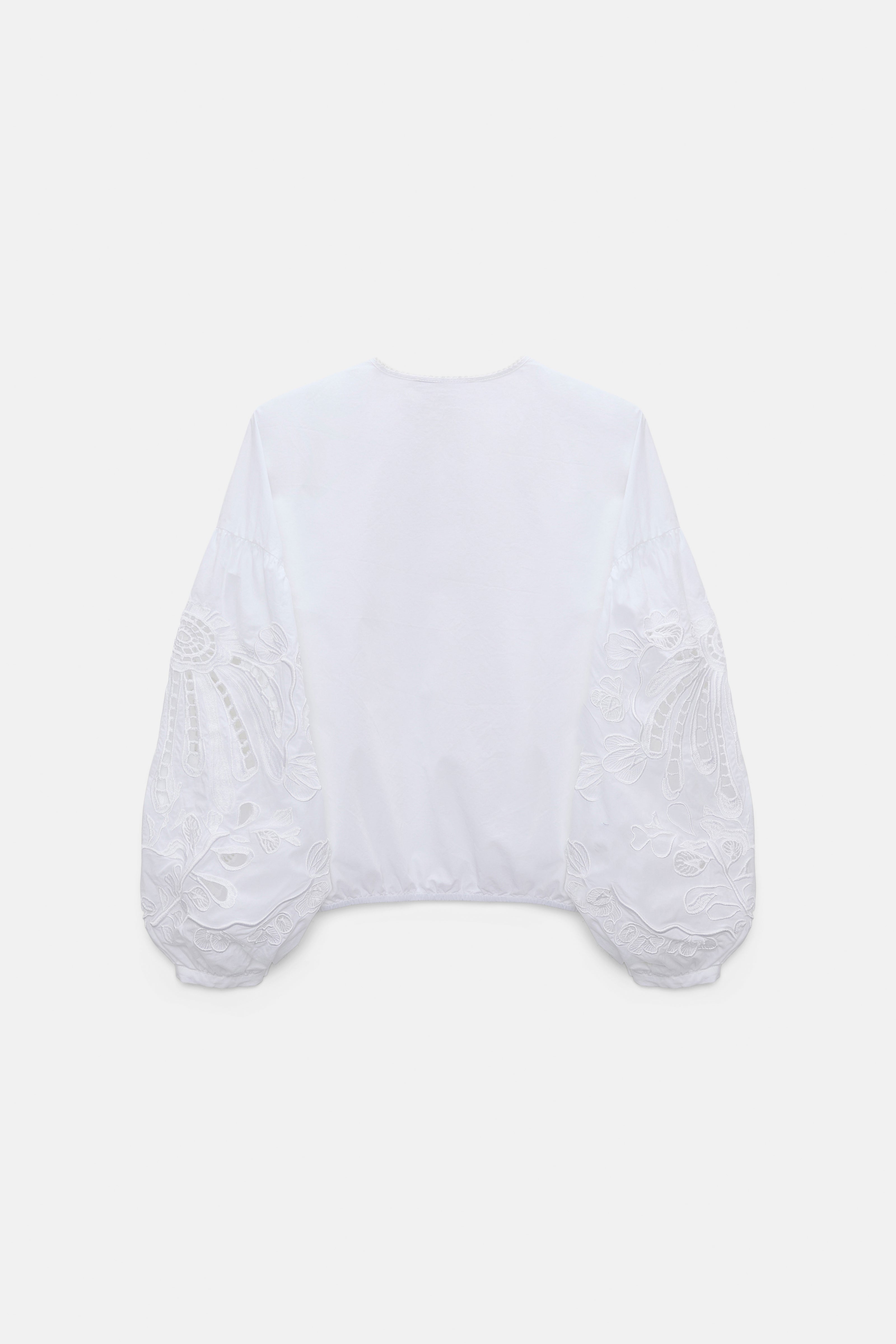 The cotton blouse has a smooth front & back and voluminous long sleeves with signature floral broderie anglaise embroidery.