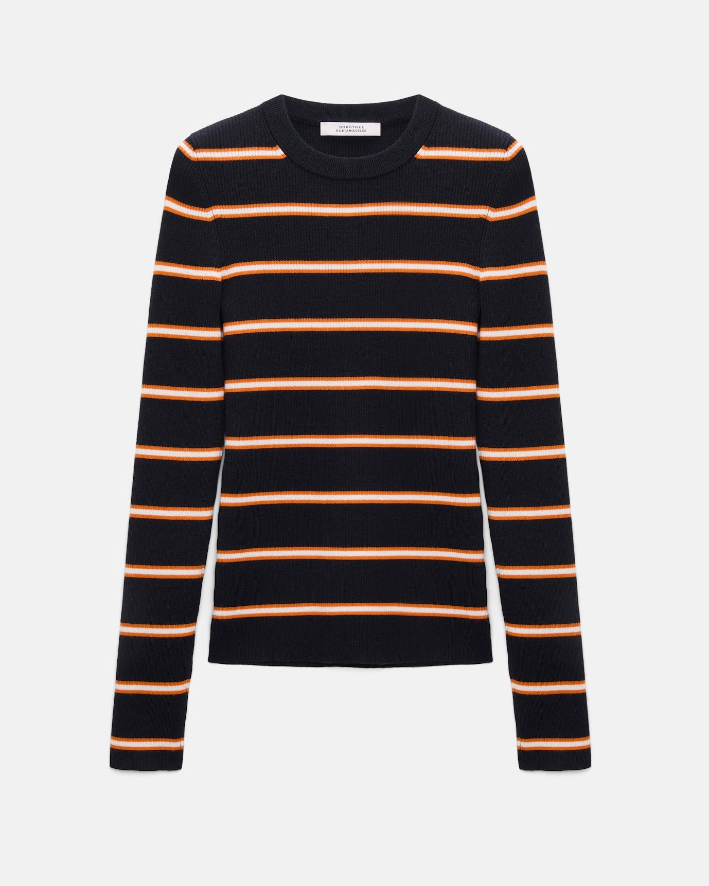 The striped pullover has a round neckline and is knit from a stretchy wool-silk mix. Wear the ribbed style as a set with the matching skirt.