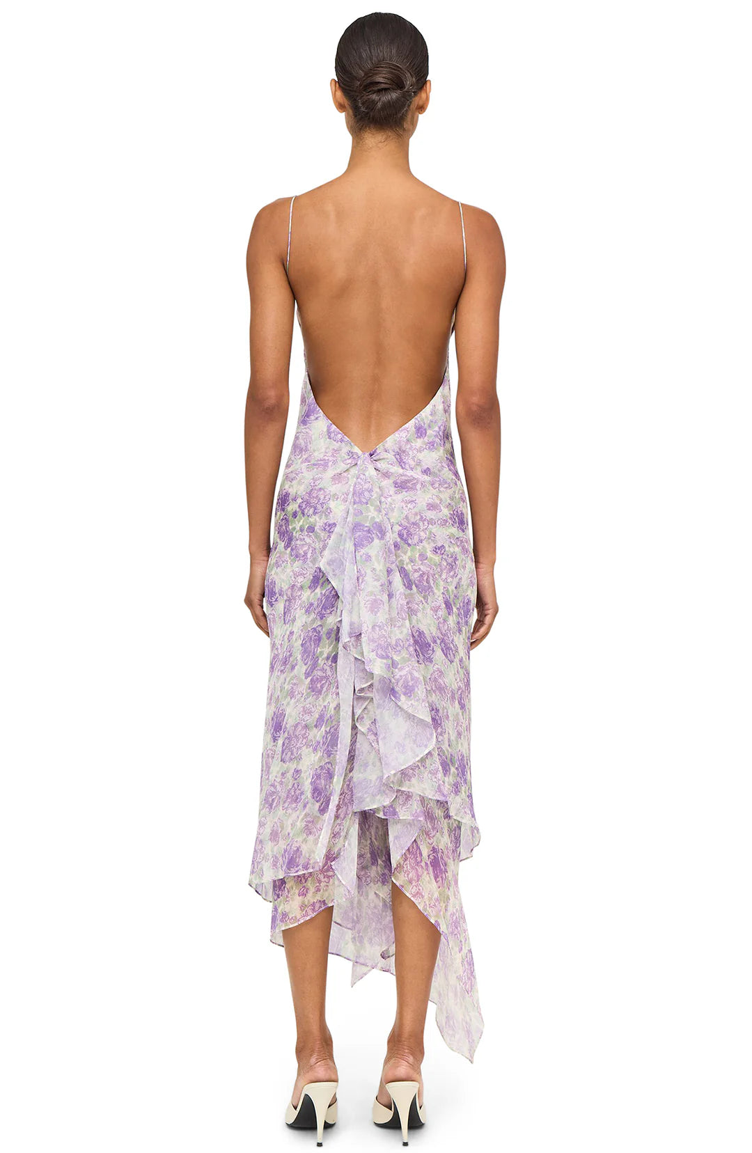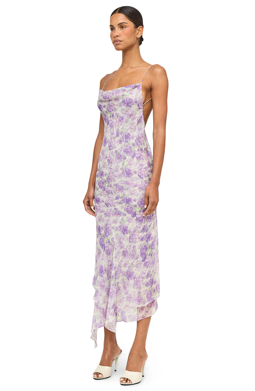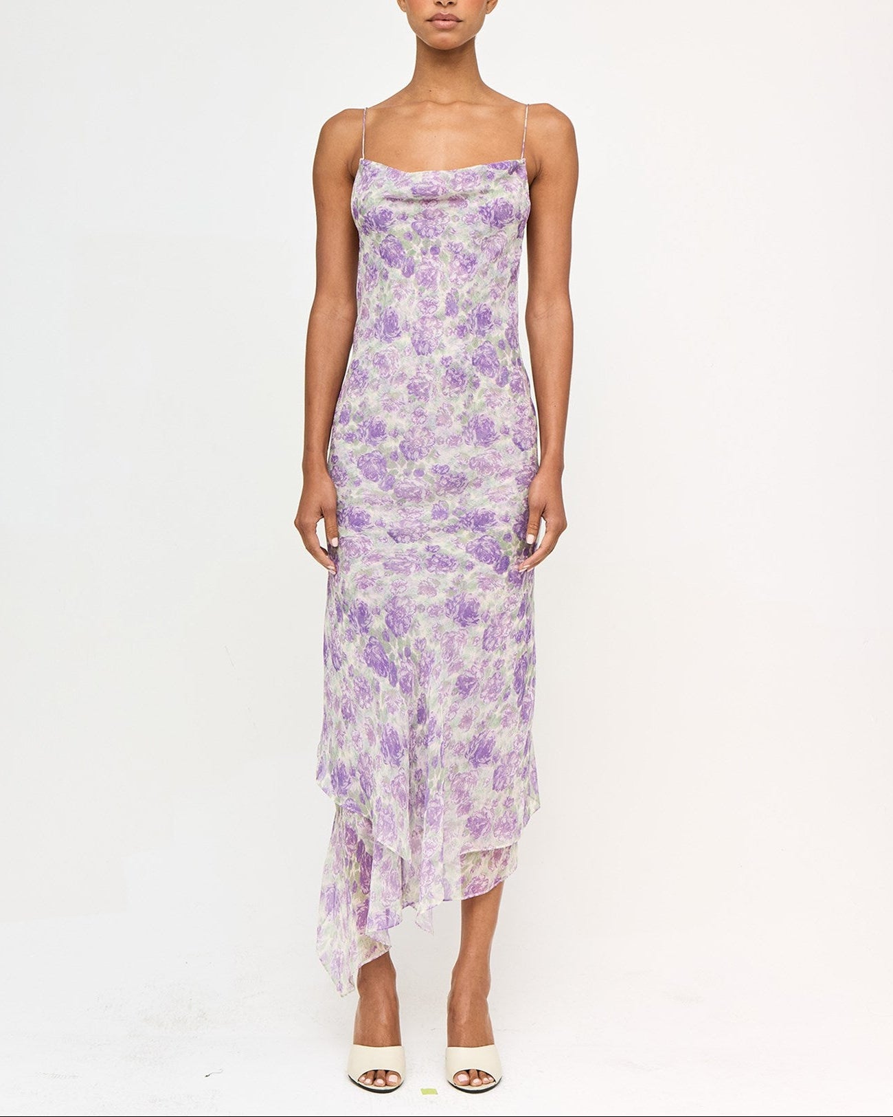 The Kaa Dress in deep purple floral is a dramatic spaghetti-strap maxi. Its voluminous, flowy silhouette moves effortlessly with every step, creating a striking and elevated look for evening occasions.