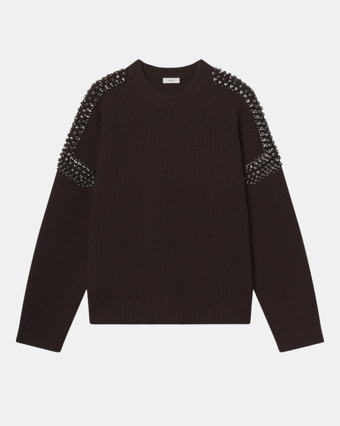 The Lennox Sweater by A.L.C. offers a refined approach to holiday shine. Crafted from 100% merino wool in a deep brown hue, this ribbed knit features crystal-embellished sleeves that catch the light in just the right way. With a relaxed fit and softly structured feel, it’s the kind of fanciful sweater that elevates even your simplest jeans or trousers—perfect for hosting, celebrating, or staying in with style.