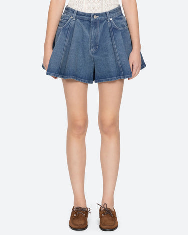 The Stasia denim shorts feature a mini silhouette with an elasticized waistband, designed with large pleats that create a softly flared shape. A modern silhouette that brings volume and movement to everyday denim.