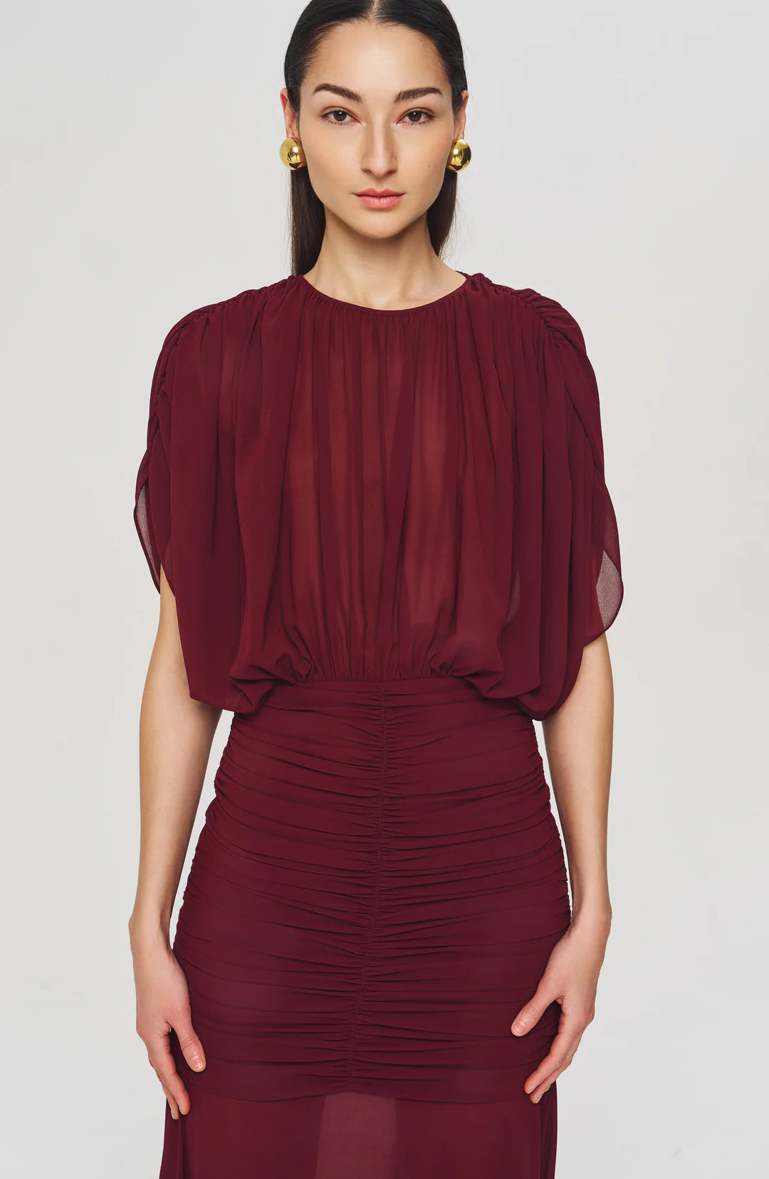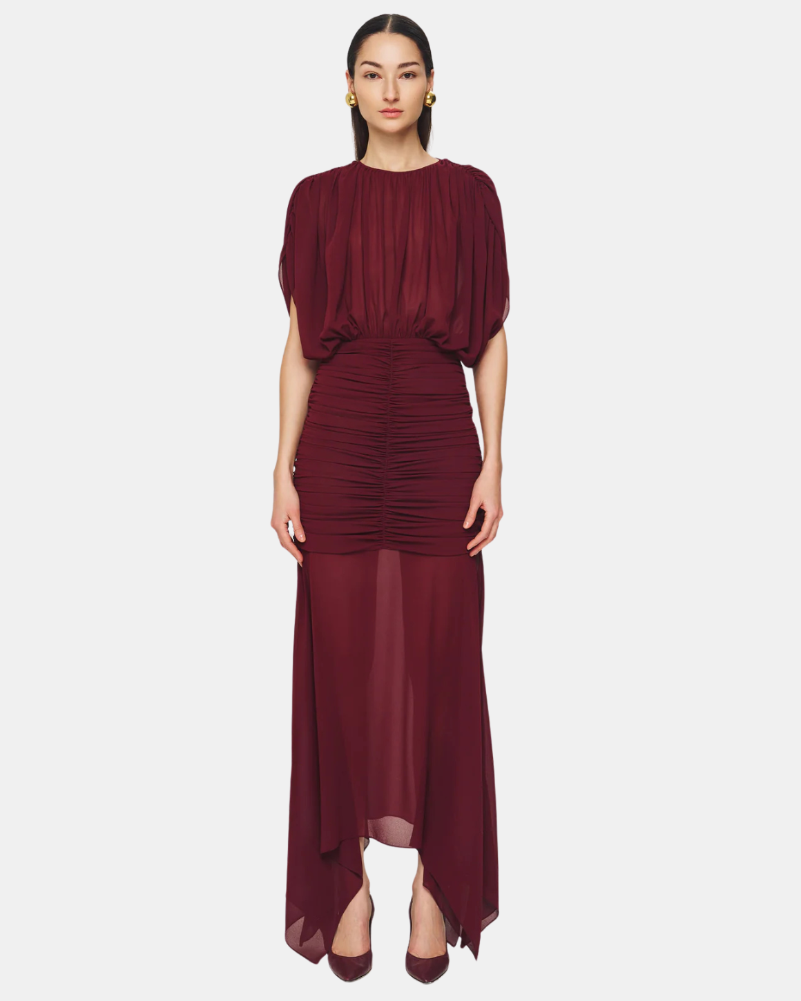 Ethereal yet grounded, the Louisa Dress by Ronny Kobo blends fluid chiffon with body-hugging ruching. The billowed sleeve creates elegant contrast against the fitted waist and sheer hemline. Designed to float with every step—this one is made for movement.