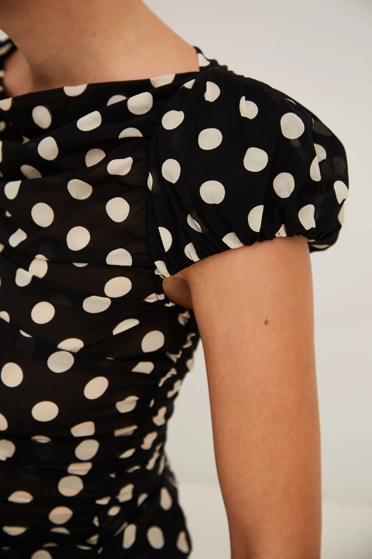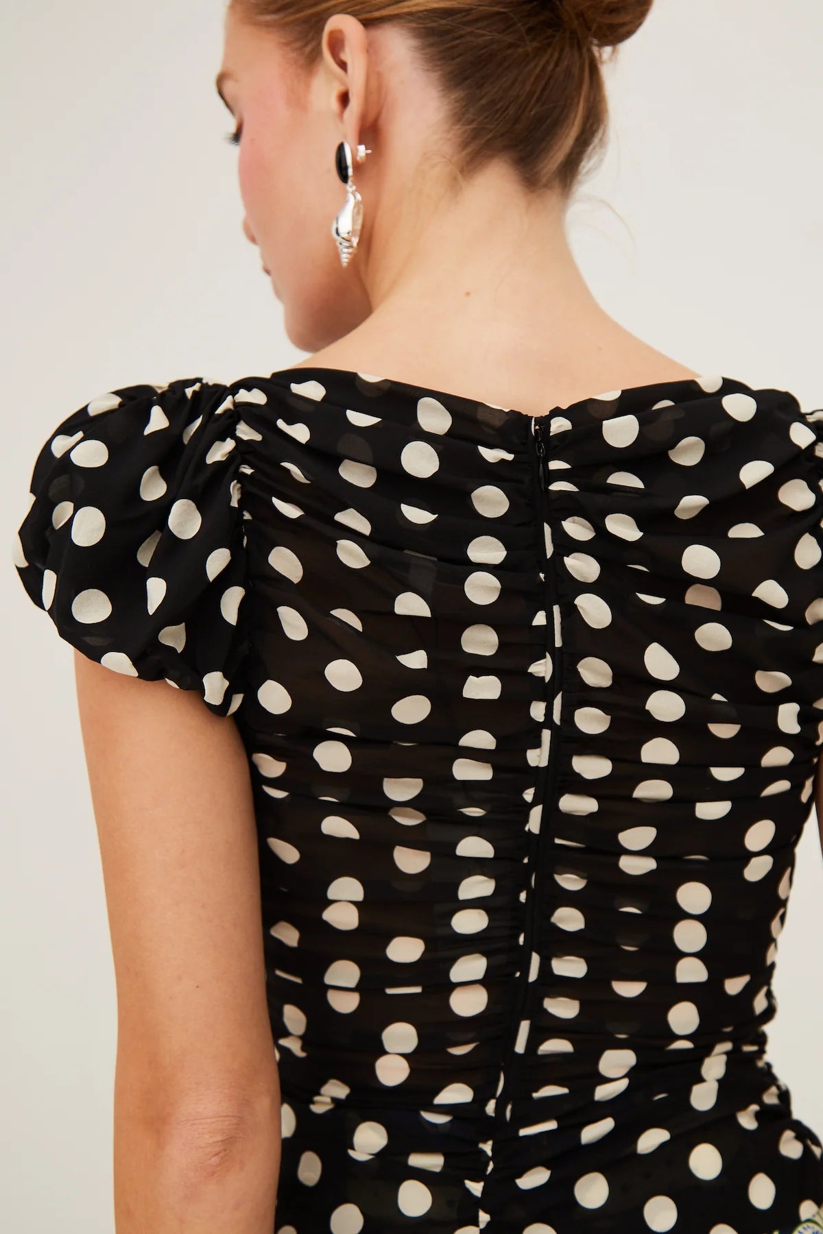 - Fitted ruched top with puff sleeves in stretch silk