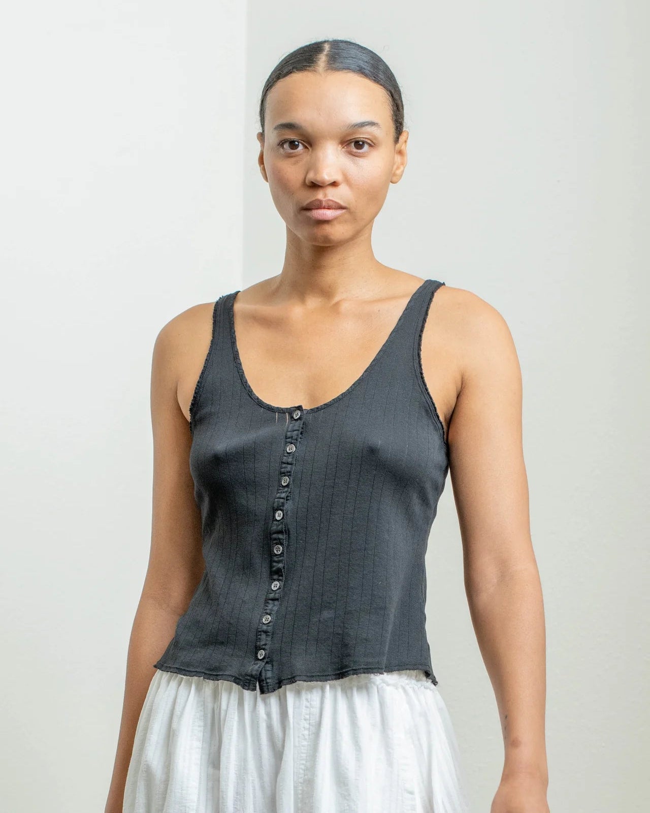 Introducing the Menlo Tank by Raquel Allegra, a delicate essential with thoughtful details, The Menlo Tank by Raquel Allegra is crafted from a semi-sheer, cotton pointelle. It features contrast fabric at the neckline and placket with buttons running all the way down, offering a peek-a-boo effect that adds dimension and versatility. It's a quiet standout on its own or under your favorite blouse.