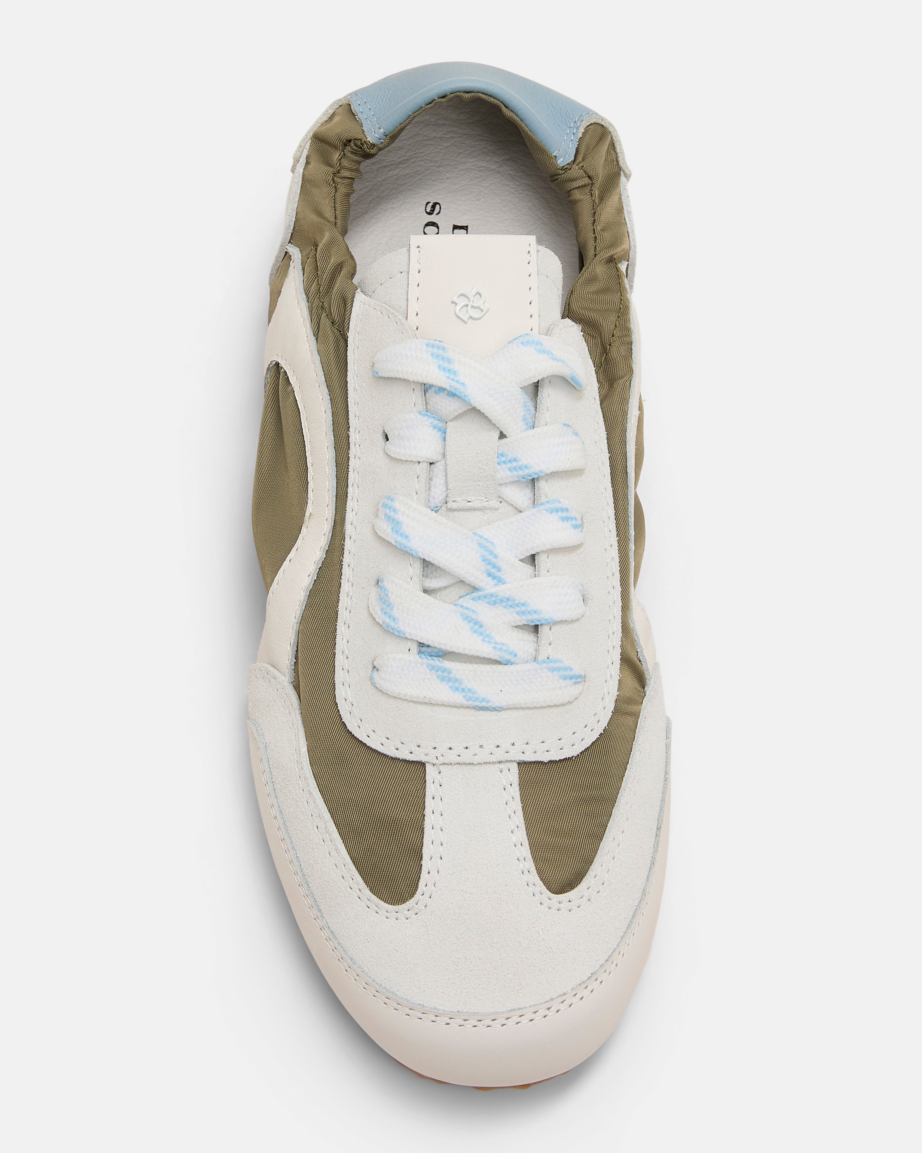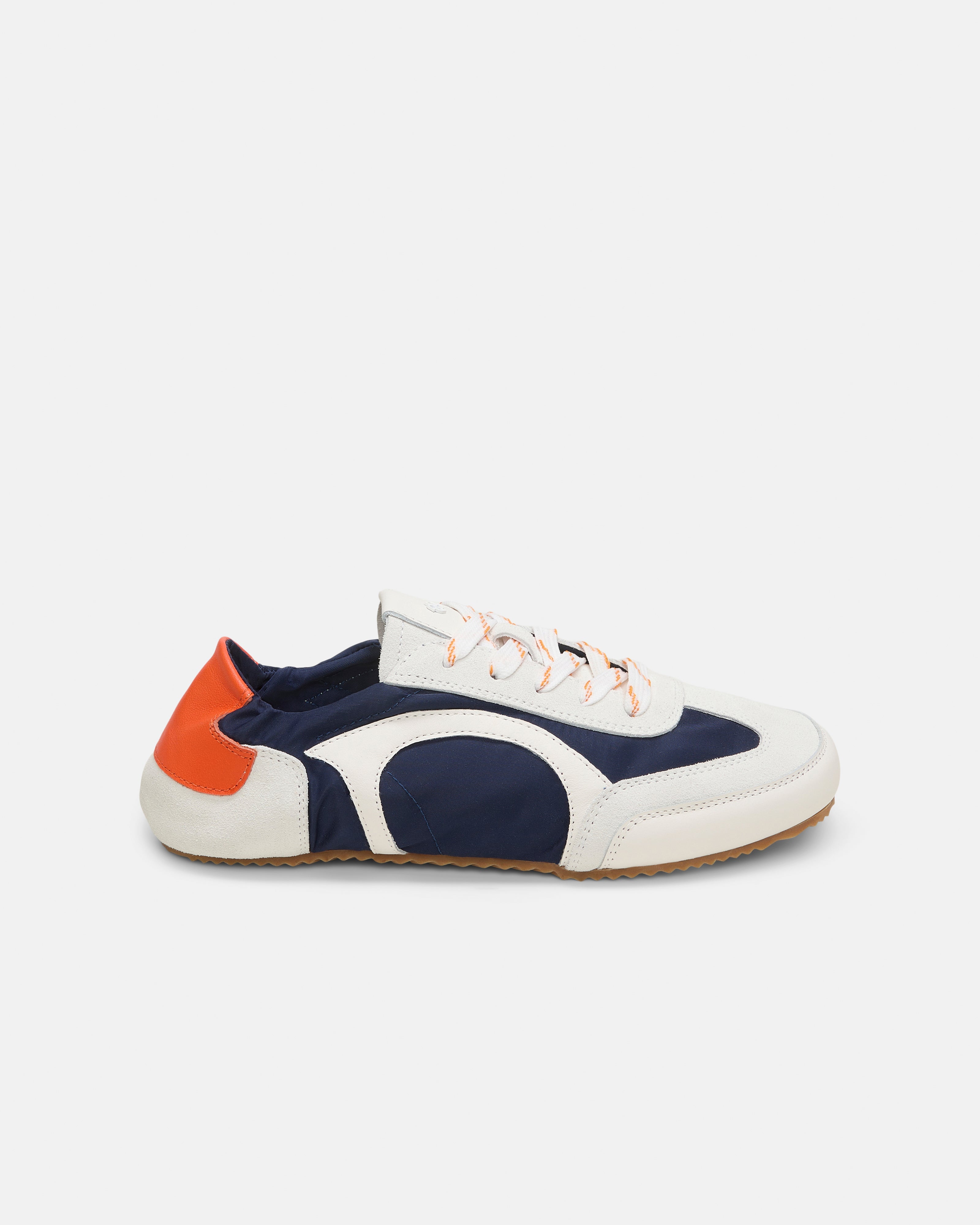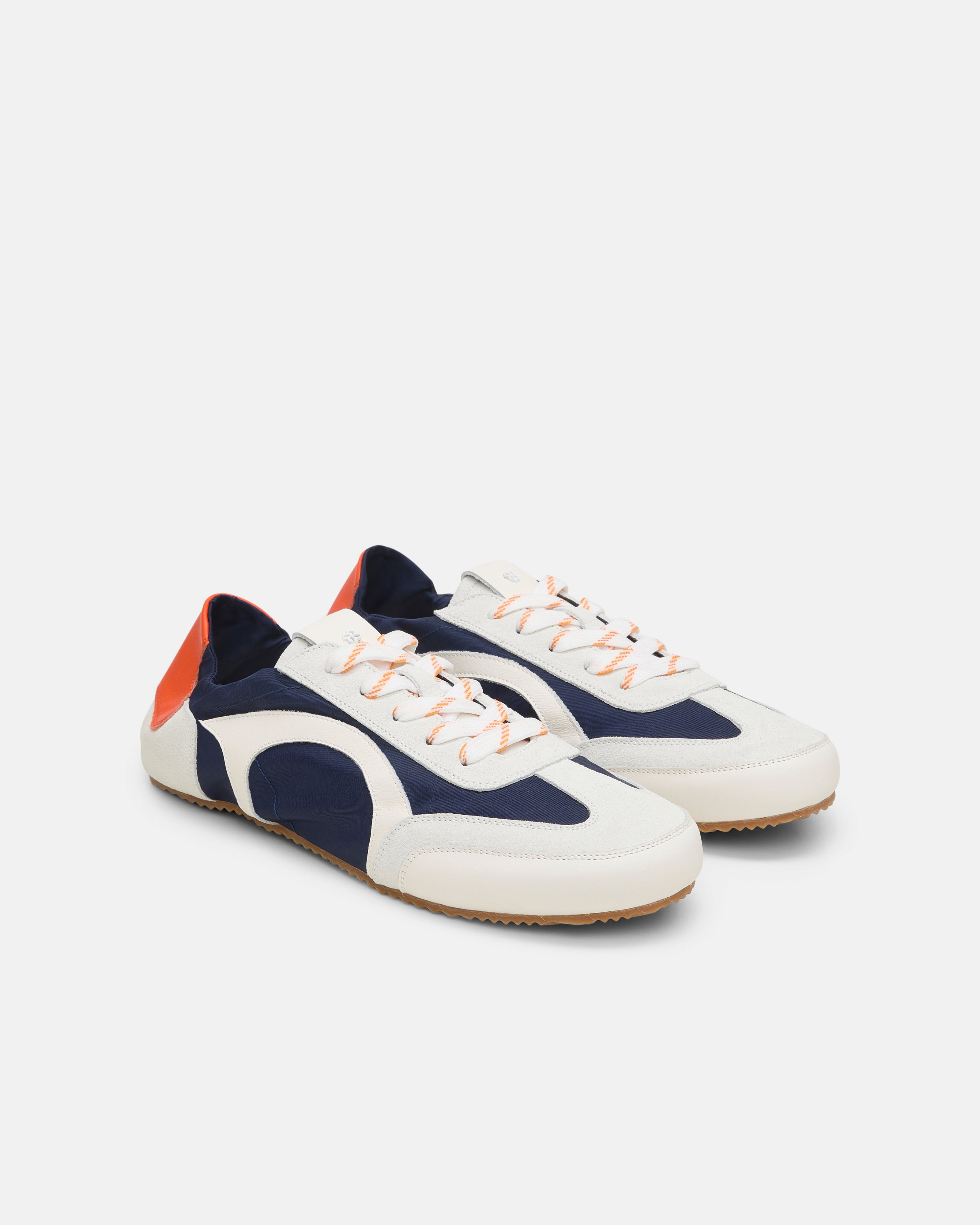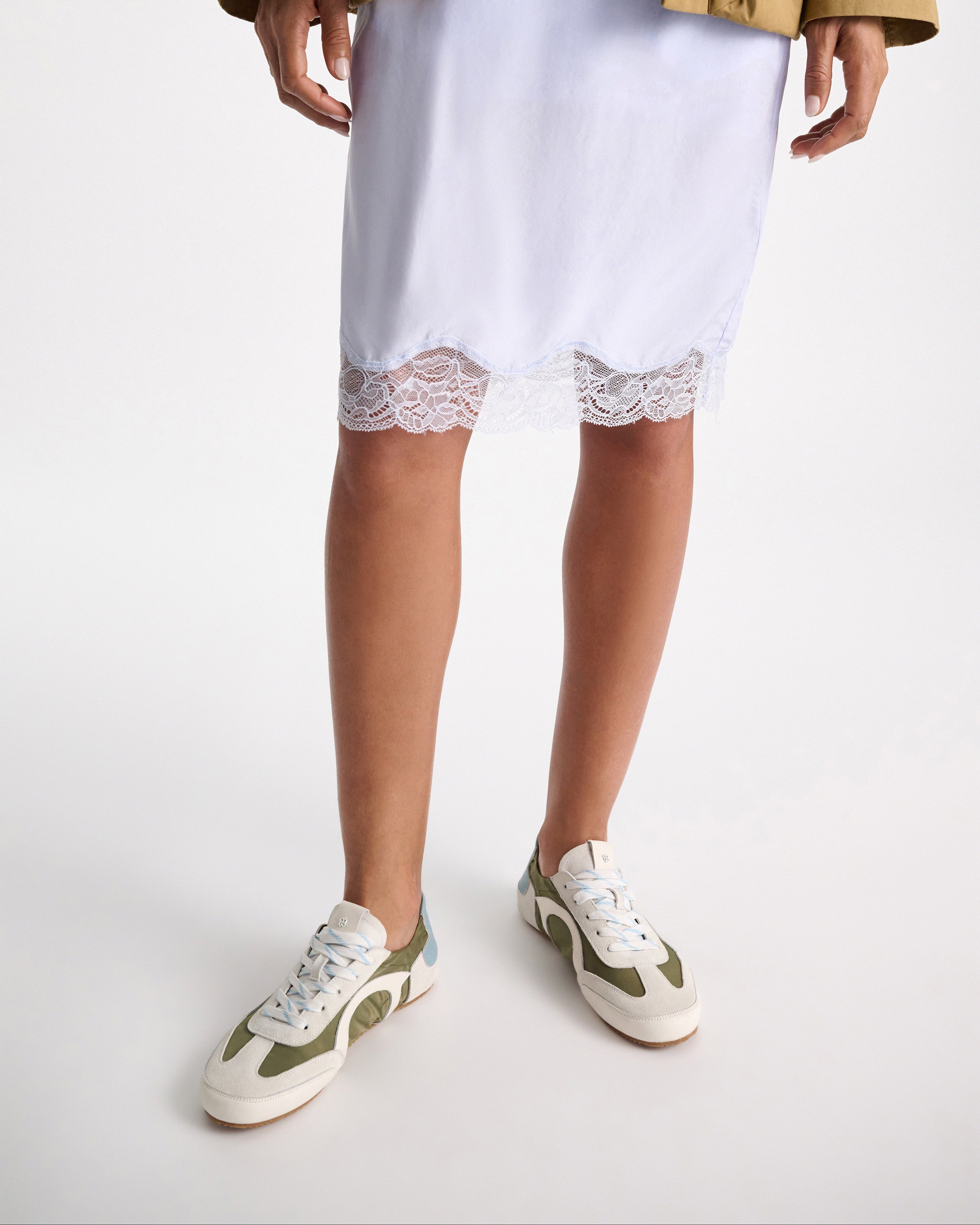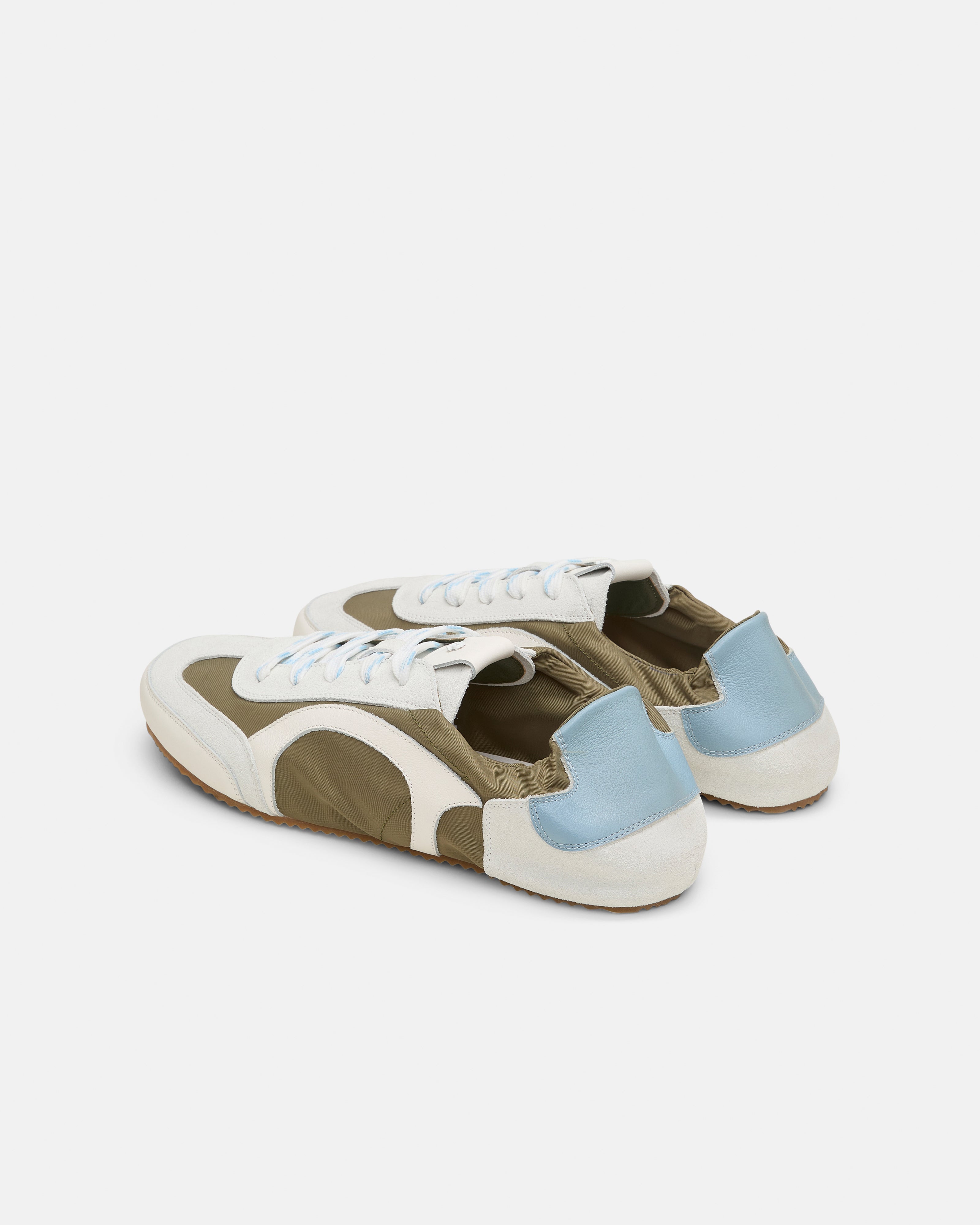 Slip on and go: The mixed material sneakers are made from a mix of suede, leather, and nylon. The sneakers have an unstructured silhouette with elastic around the top.
