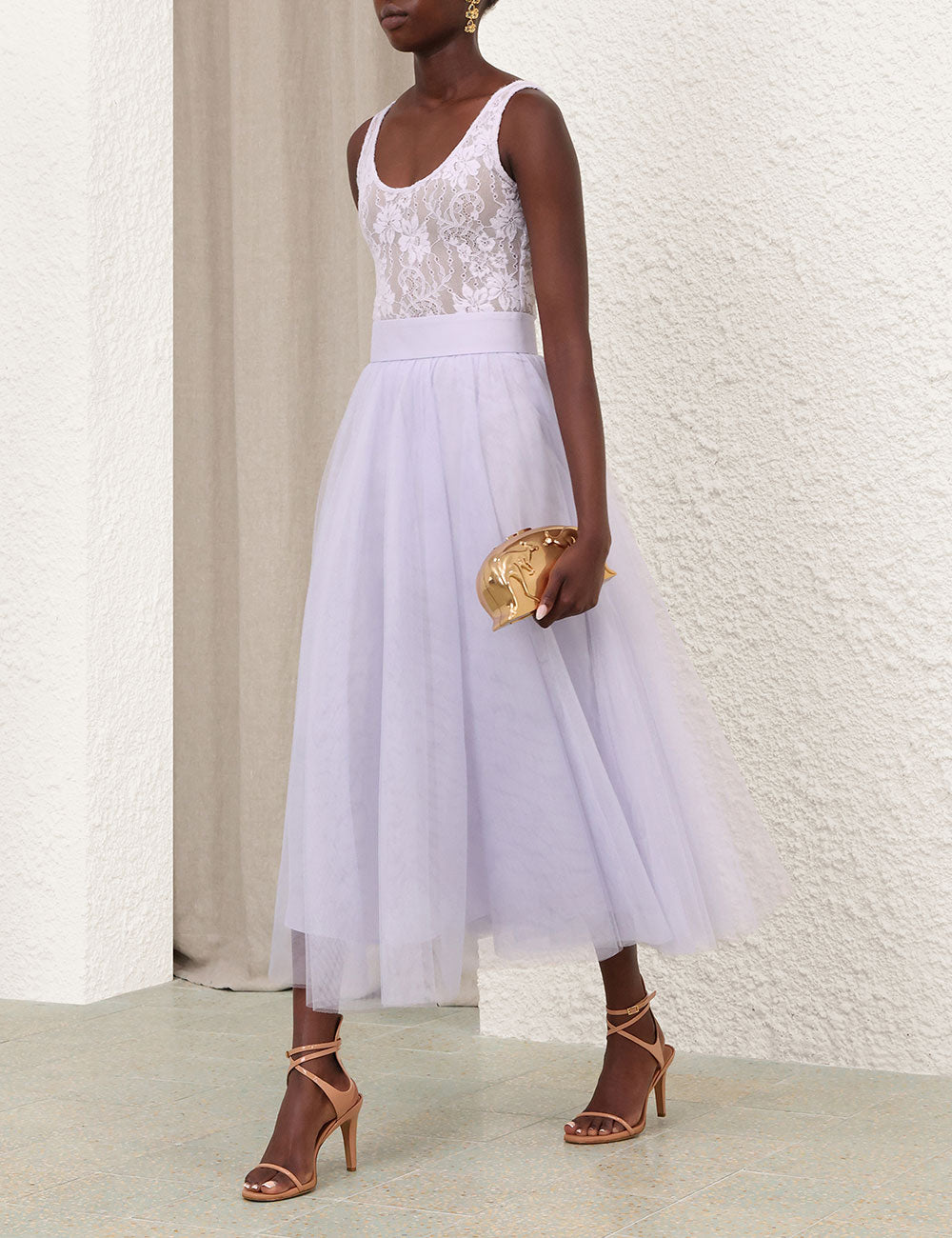 The Lace Scoop Bodysuit in Lilac from Zimmermann's Spring 2026 Collection, Kindred Spirit. A lace bodysuit featuring mesh lining, with a scoop neckline and back.