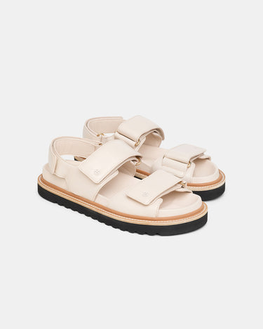 The leather sandals feature a comfortable padded footbed and adjustable Velcro straps. The flat sandals have matching enamel D-rose studs and a stitched leather welt atop black tread soles.