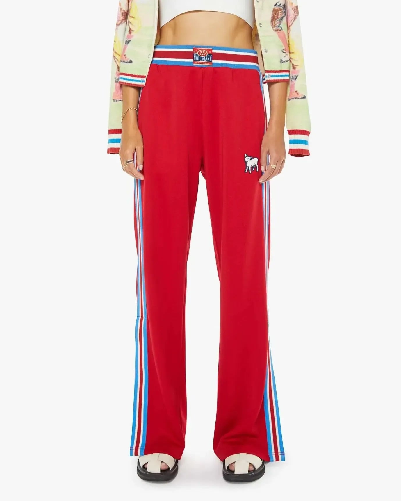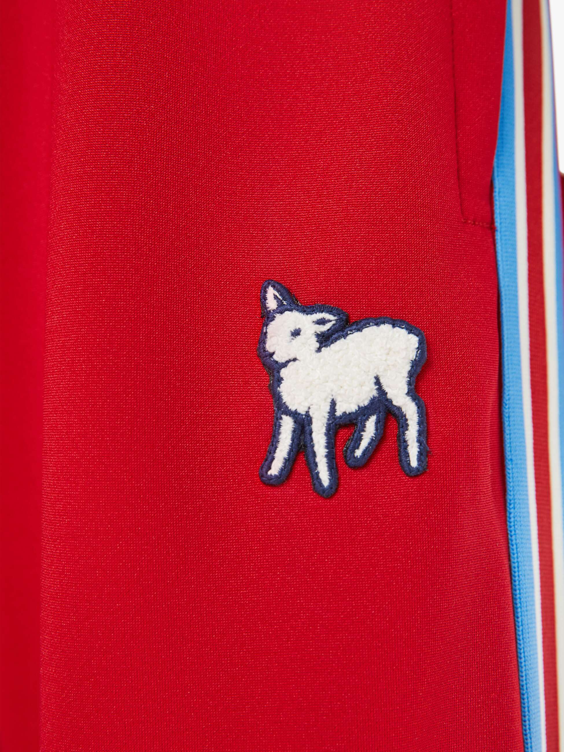 Athletic-inspired pants with an elastic waistband and a loose straight leg. Designed in bright red, the pants feature striped panels down the outer seams and waistband and a fuzzy lamb patch on the thigh.