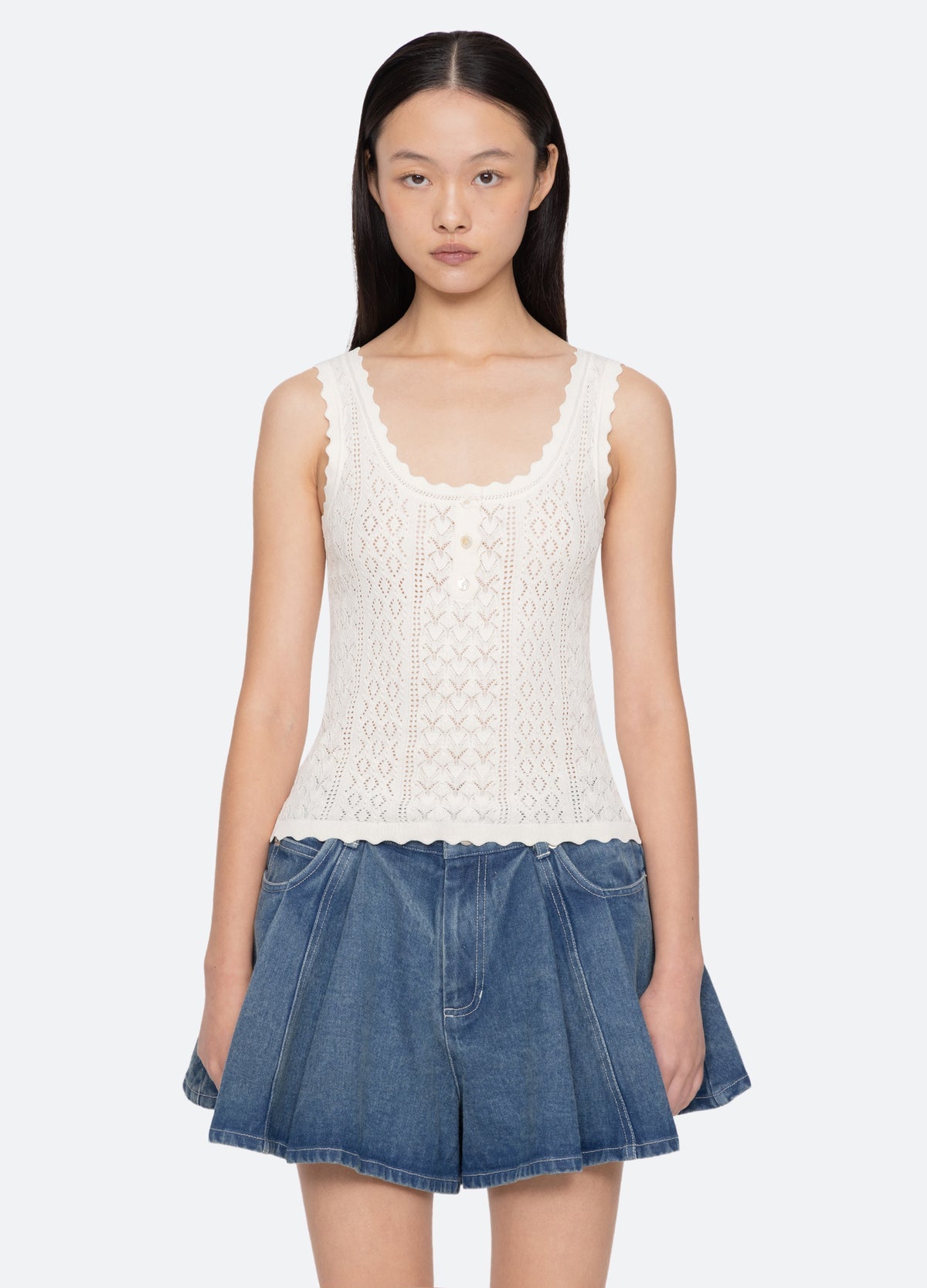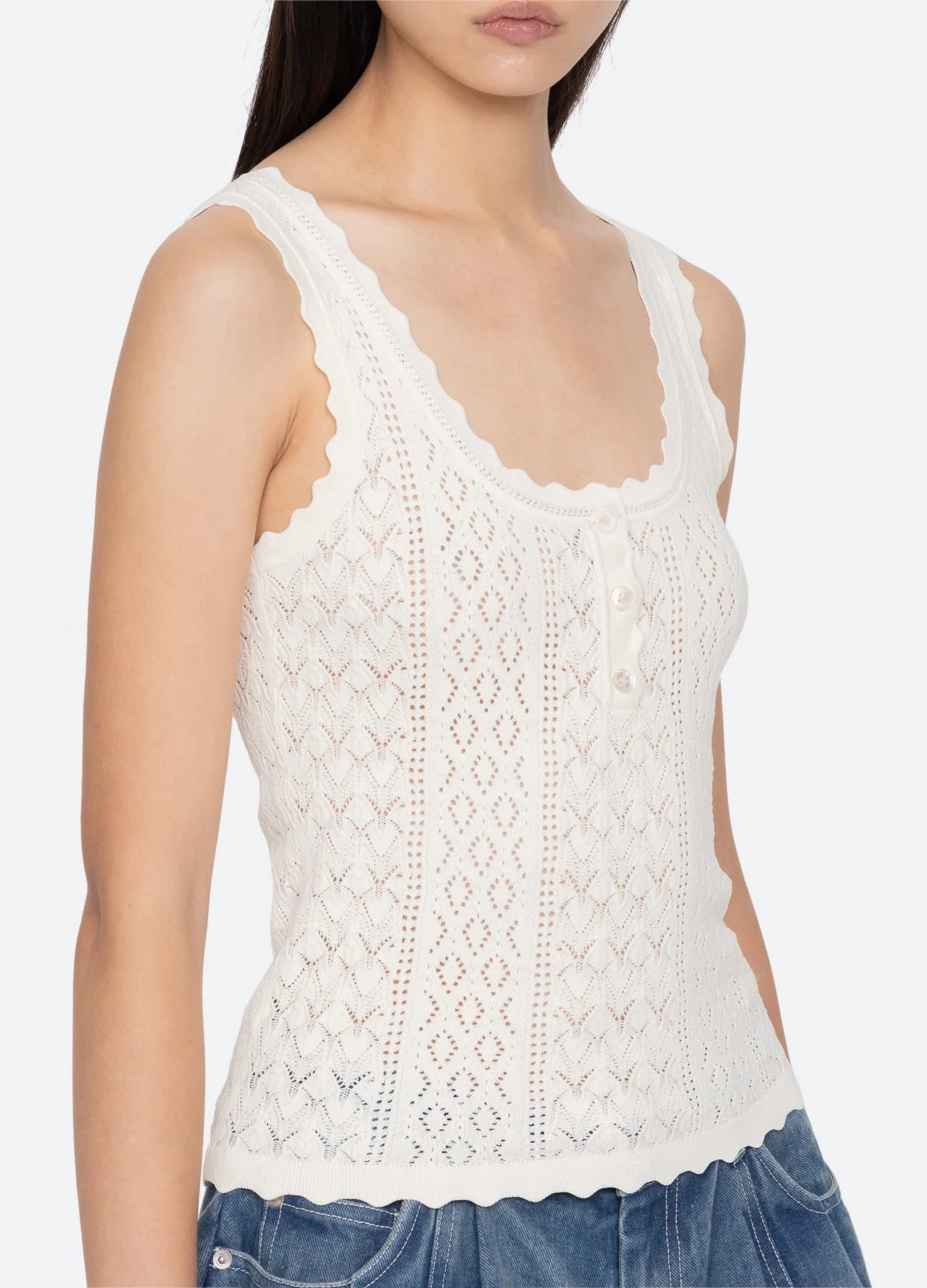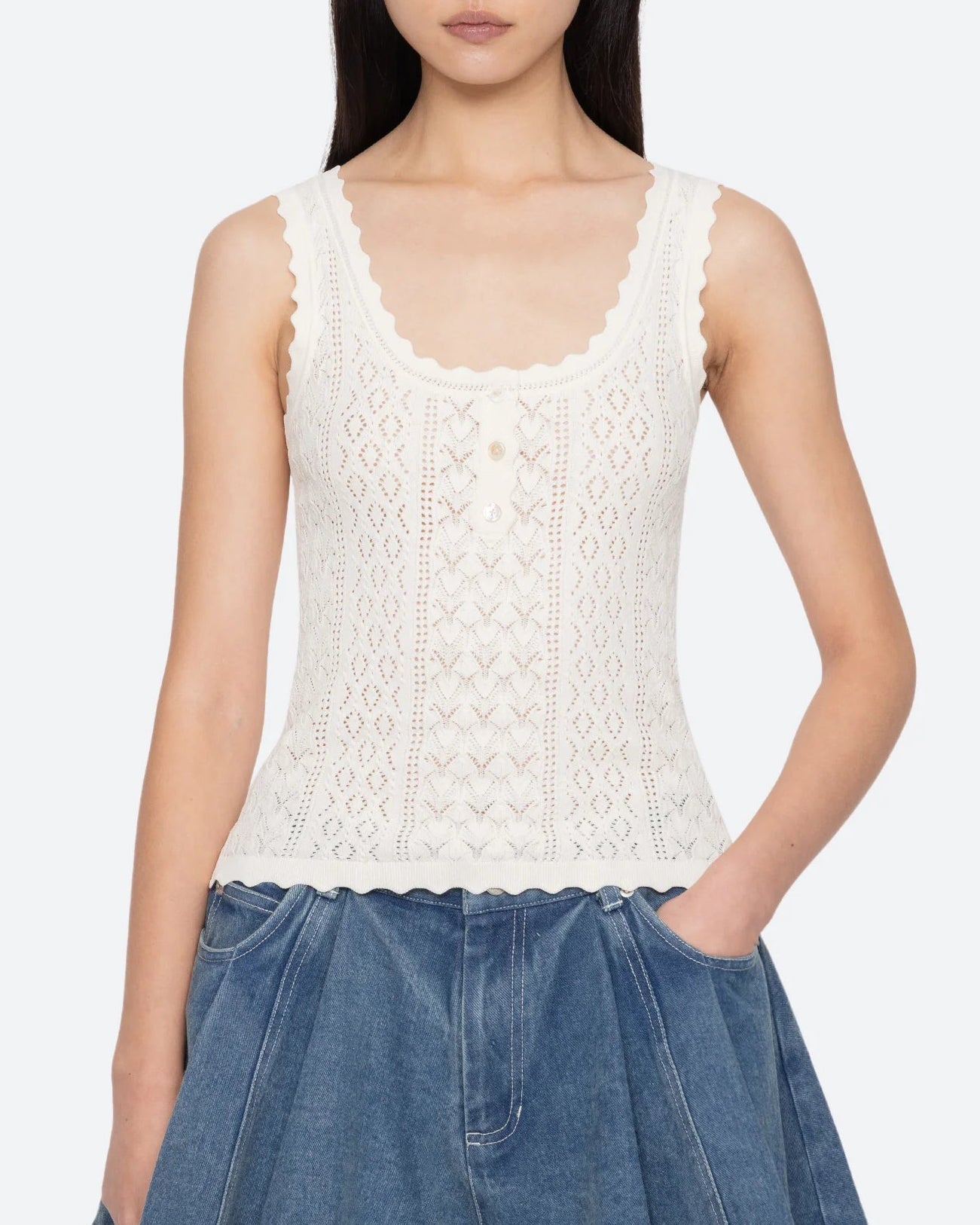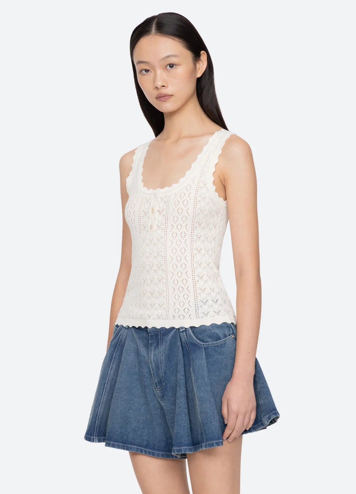 The Georgia knit tank features a delicate pointelle knit, scalloped edges, and a slim, flattering fit. Perfect for layering, it adds subtle texture and refined detail to any ensemble.