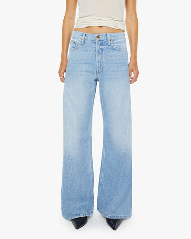 Wide leg jeans from SNACKS!, a collection of unconstrained silhouettes leaning into exaggerated shapes and extreme proportions. Experimental and non-era specific. For everyone, or not. Designed to sit on the hips with a slouchy fit, these high rise jeans have a zip fly, loose wide leg with a curved outer seam and a 31-inch inseam with a clean hem. Made from a rigid recycled cotton blend, Munchies is a light blue with subtle whiskering, fading at the knees, a pretzel-detailed button and candy-inspired interior rivets. Would you like a treat?