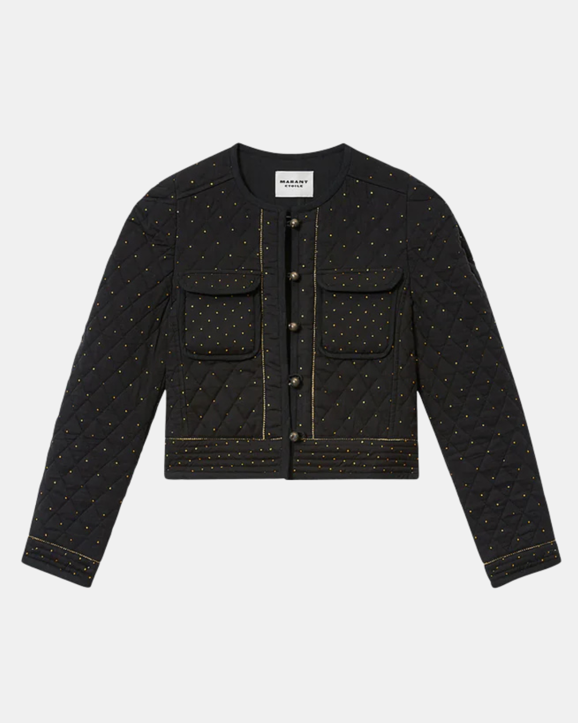 Polka Dot Quilted Jacket by Isabel Marant Étoile. A playful statement with a tailored edge, this cropped jacket is crafted from organic cotton and adorned with contrasting gold polka dots. The quilted fabric and structured shoulders create a defined silhouette, while contrasting trim at the front, cuffs, and waistband adds graphic polish. Finished with metal buttons and chest flap pockets, it’s a standout layer that pairs effortlessly with high-rise denim or sleek tailoring.